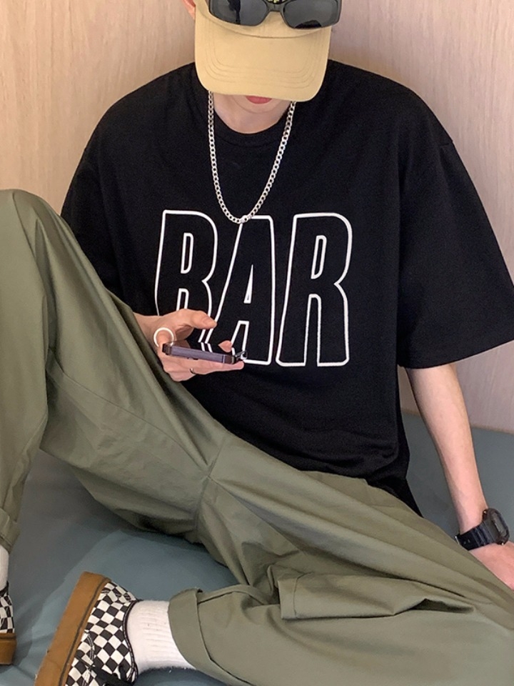 圆领卷边T恤,撞色字母图案印花色彩斑斓韵味十足。下身搭配潮流休闲裤,腰际的抽拉绳腰带可以根据自己的需求进行调节,方便且实用。
