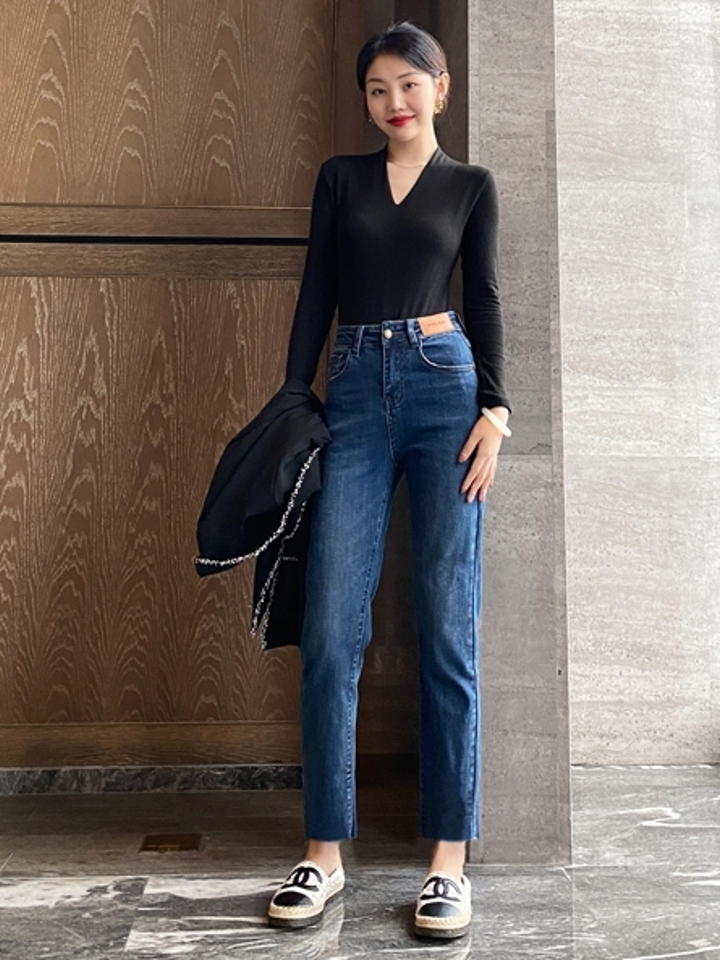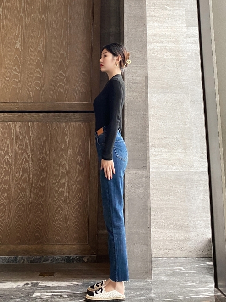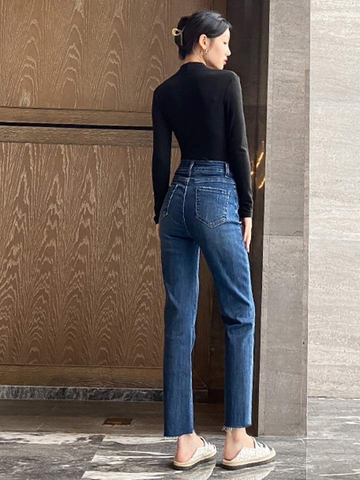 高腰设计,拉长身材比例。高腰牛仔裤,显瘦显腿长。直筒裤型,修饰腿部线条。
