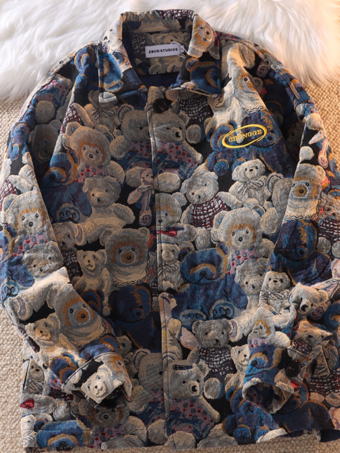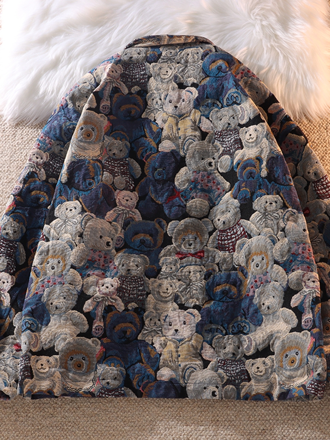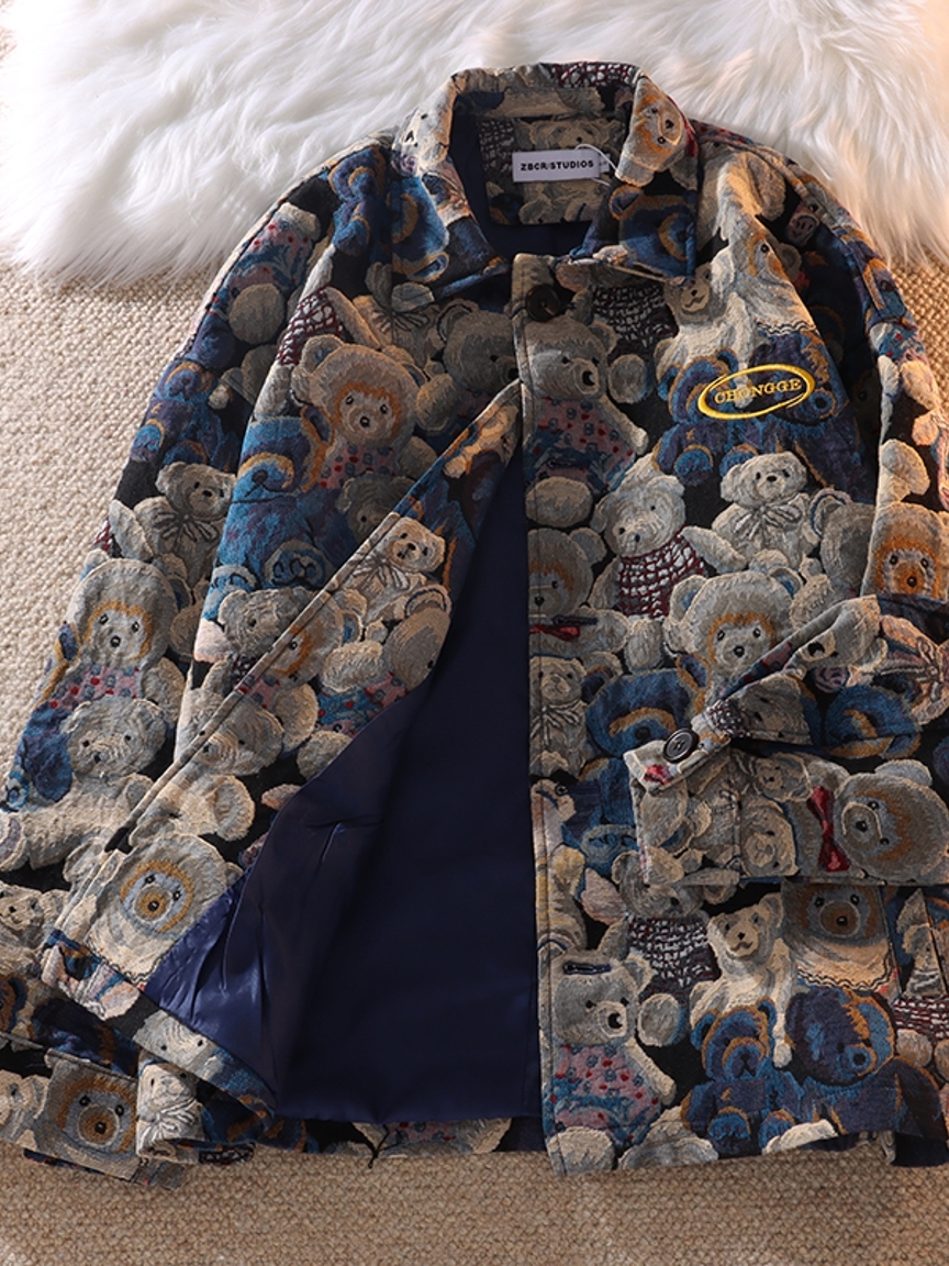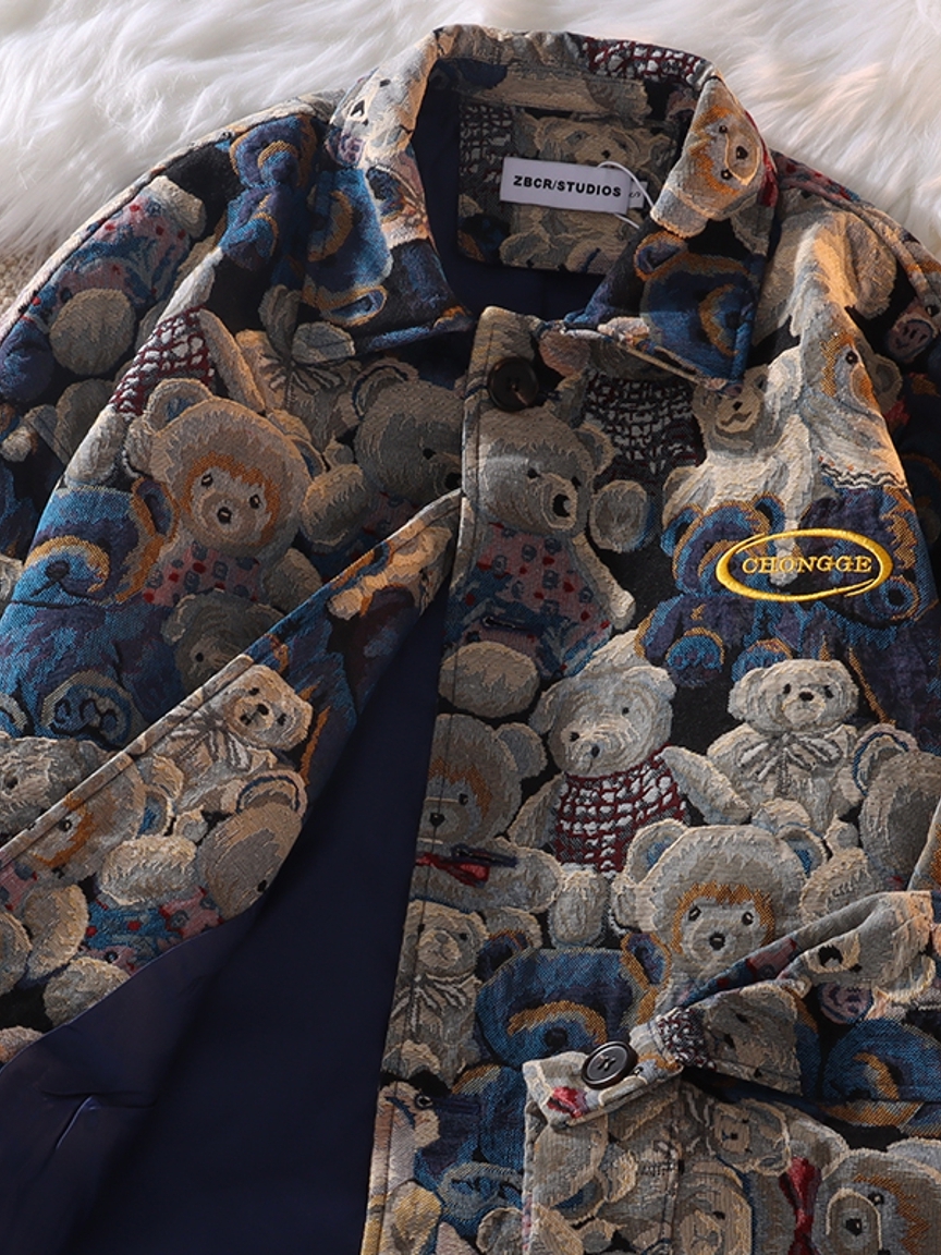 简约时尚的翻领,既拉长了颈部线条,又完美的修饰了脸型。满版的小熊印花设计,兼具时尚元素与个性。宽松的版型在显瘦的同时,又增加衣服的层次感。