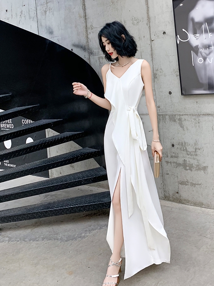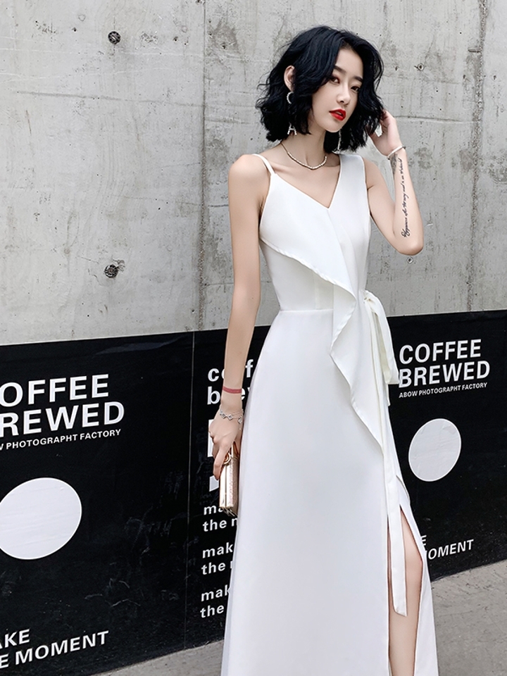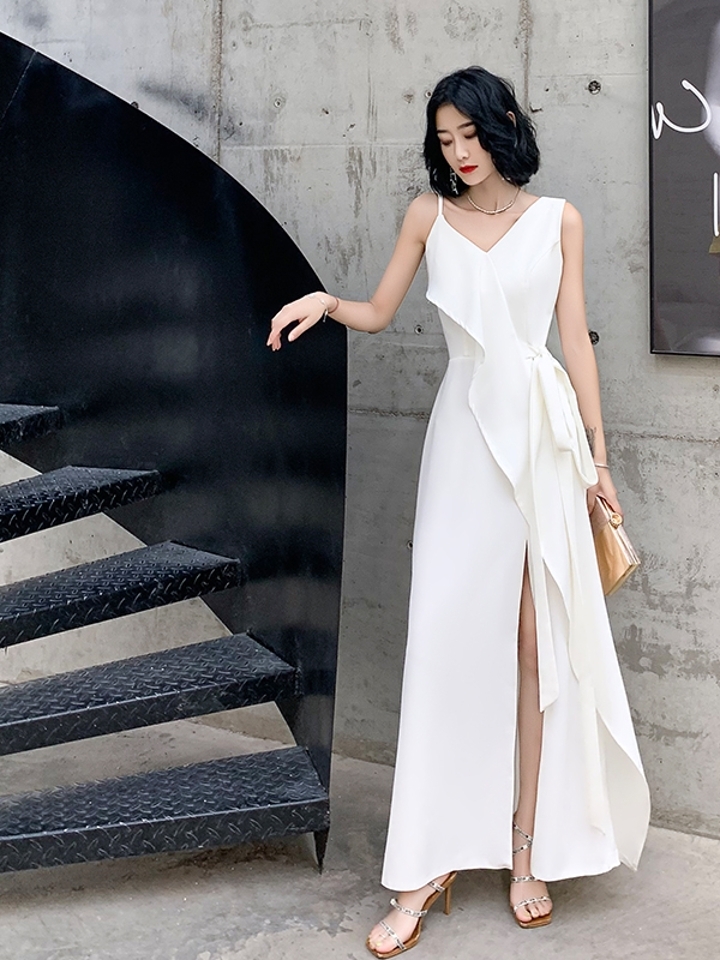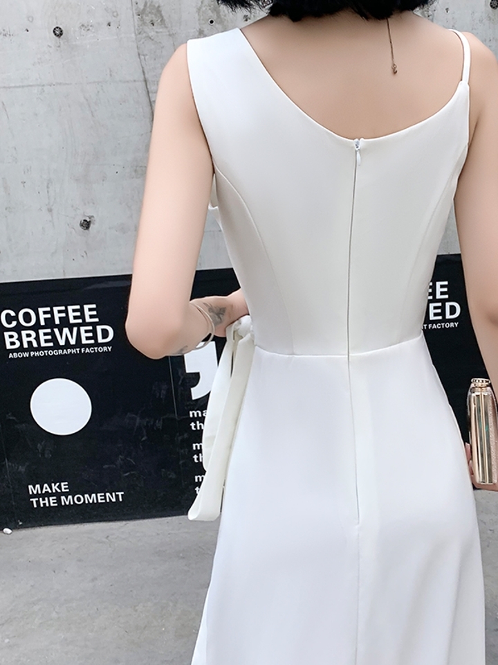 时尚简约的圆领设计尽显女性的柔美,精美的绣花从细节处彰显整体的质感,隐形拉链拉合顺畅穿脱方便,面料穿着舒适有光泽感,高开叉的设计大胆不失女人味,行走间露出女性的修长美腿风情万种。