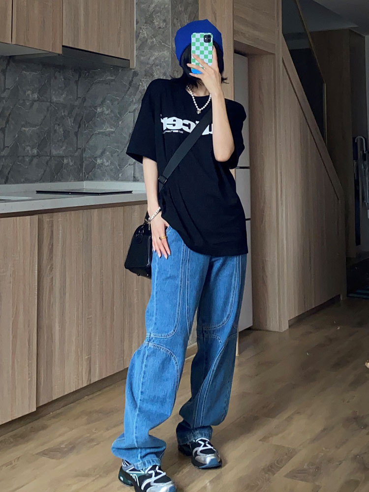 高腰设计,拉长身材比例。高腰牛仔裤,显瘦显腿长。直筒裤型,修饰腿部线条。