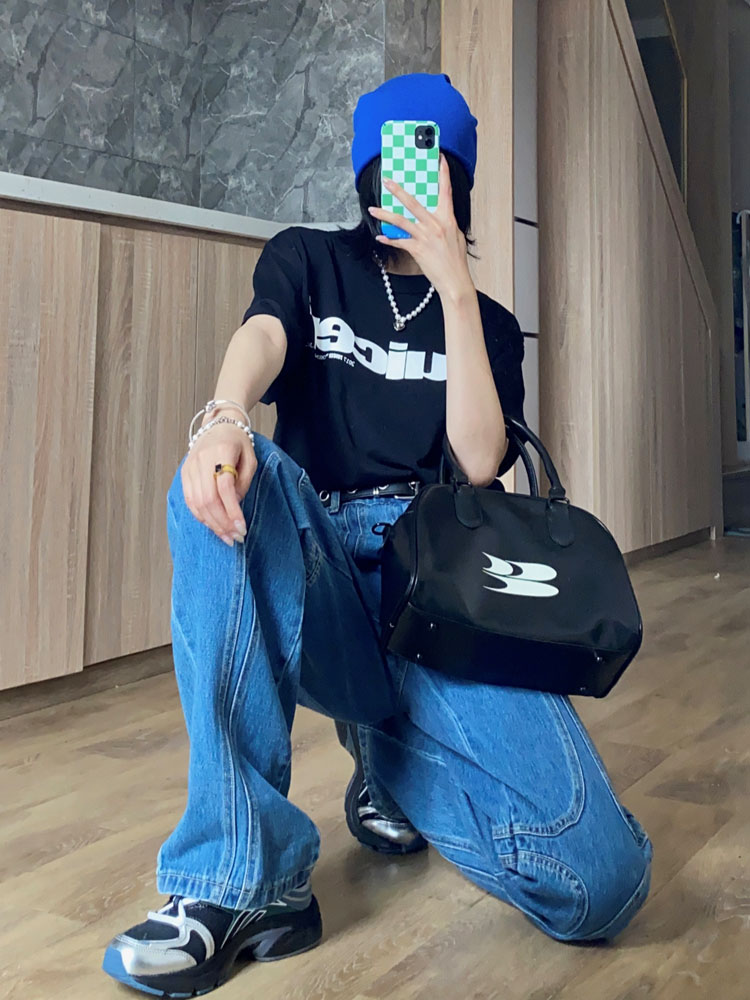这款t恤是简约的风格,宽松的版型,时尚百搭,胸前的字母印花,很有个性,搭配牛仔裤或者短裤都很好看。