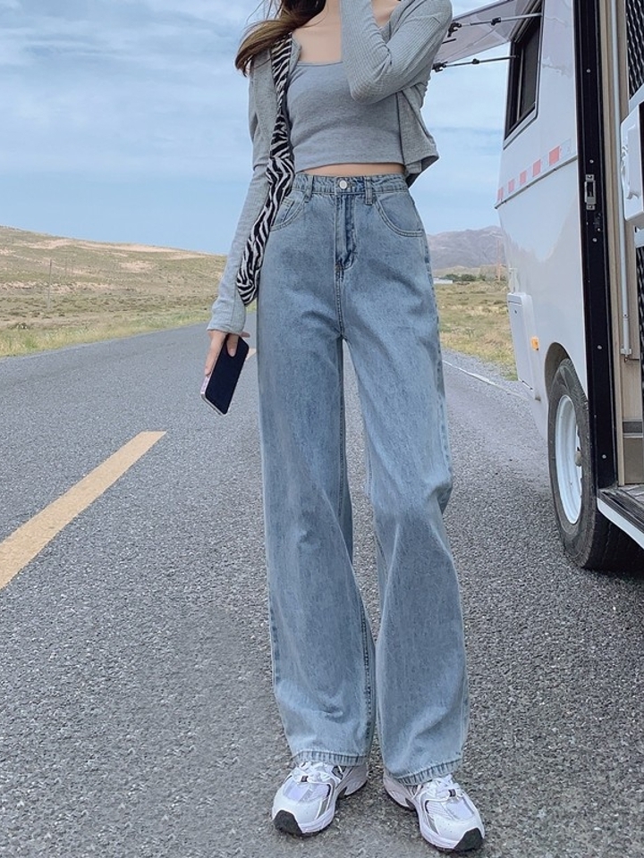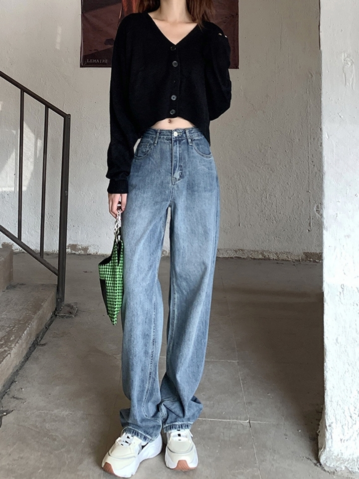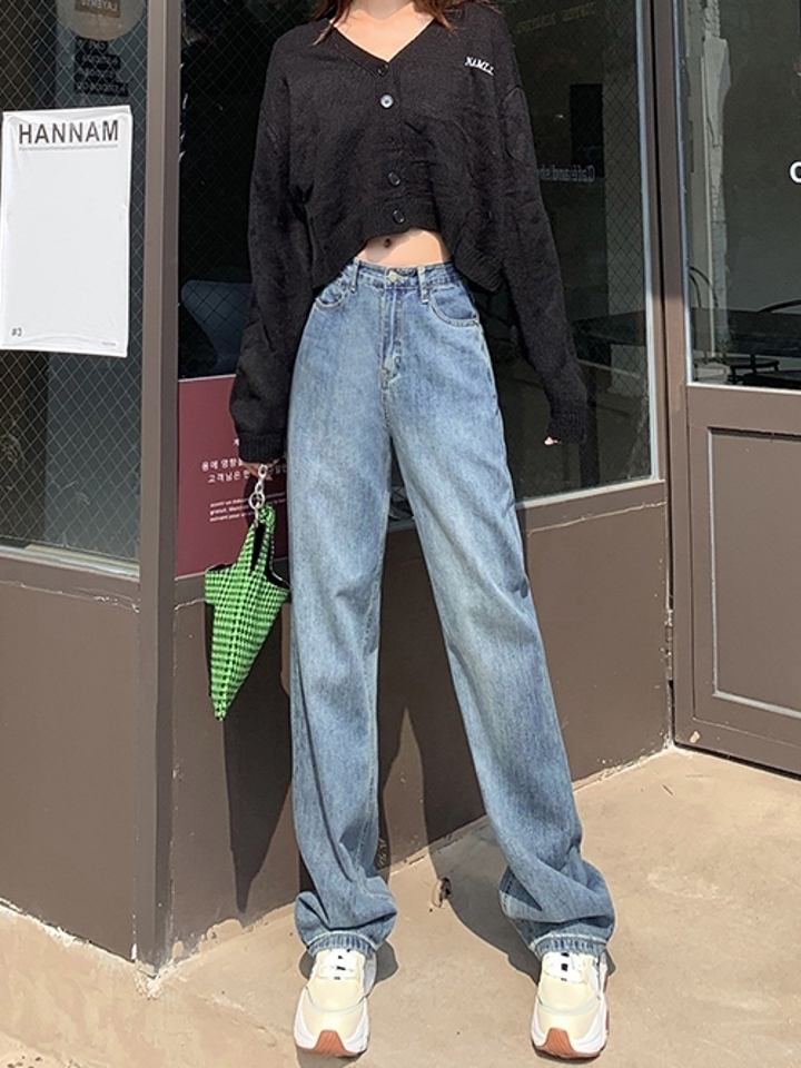 复古的牛仔阔腿裤,高腰设计,让阔腿裤成为拉长比例的必备神器。宽松的裤腿,裤脚可以翻起来,看上去更有质感,腰间搭配一个简约圆形腰带,更有时尚感。