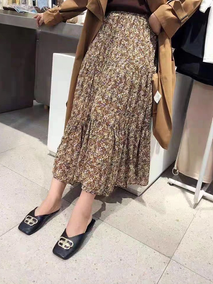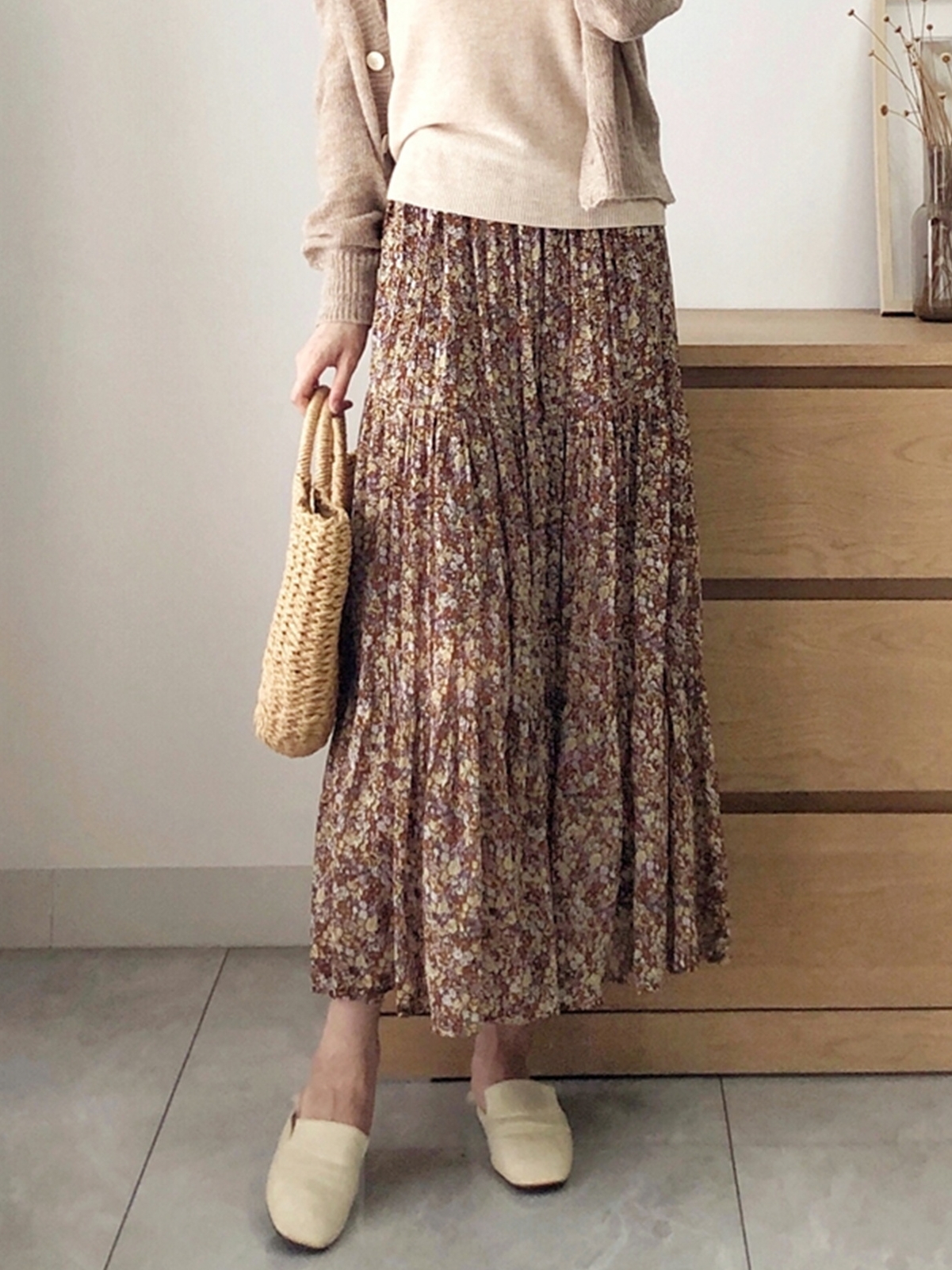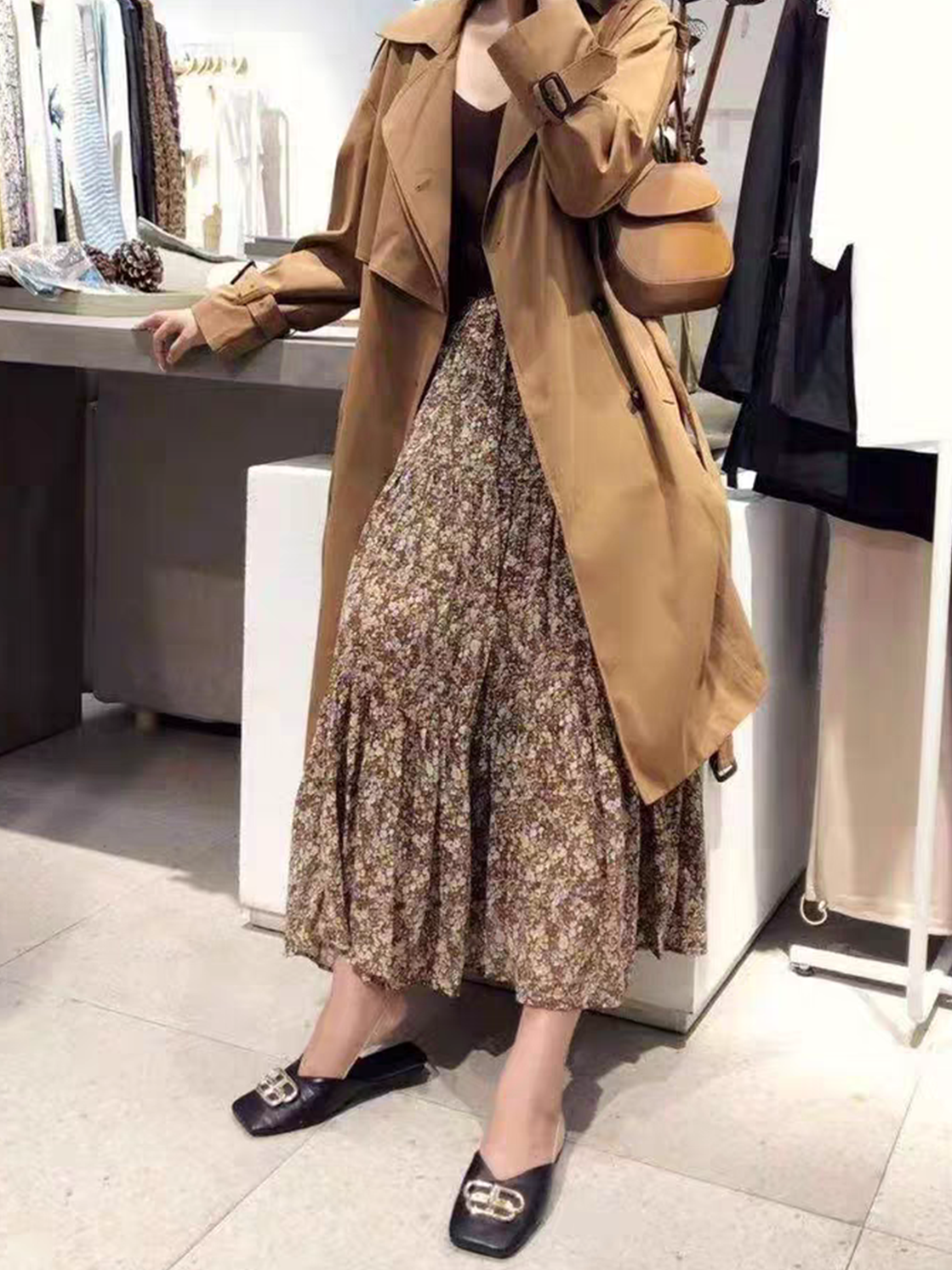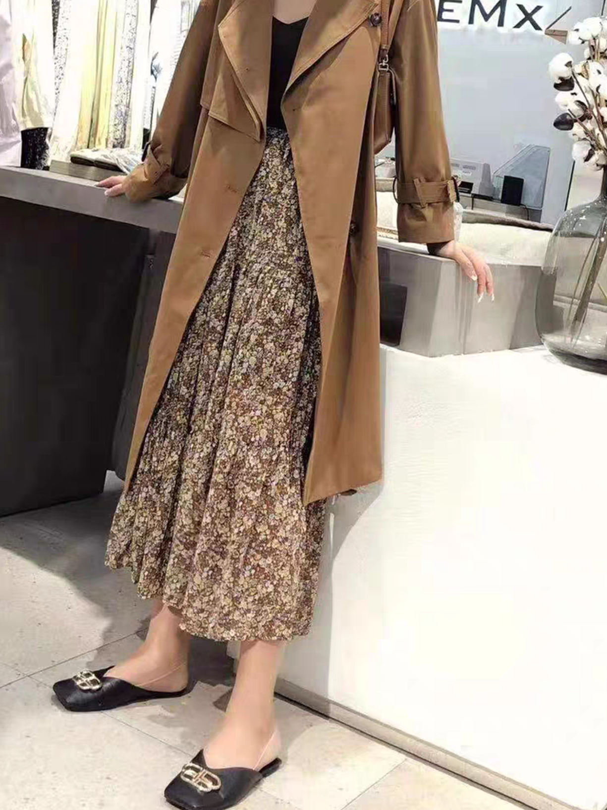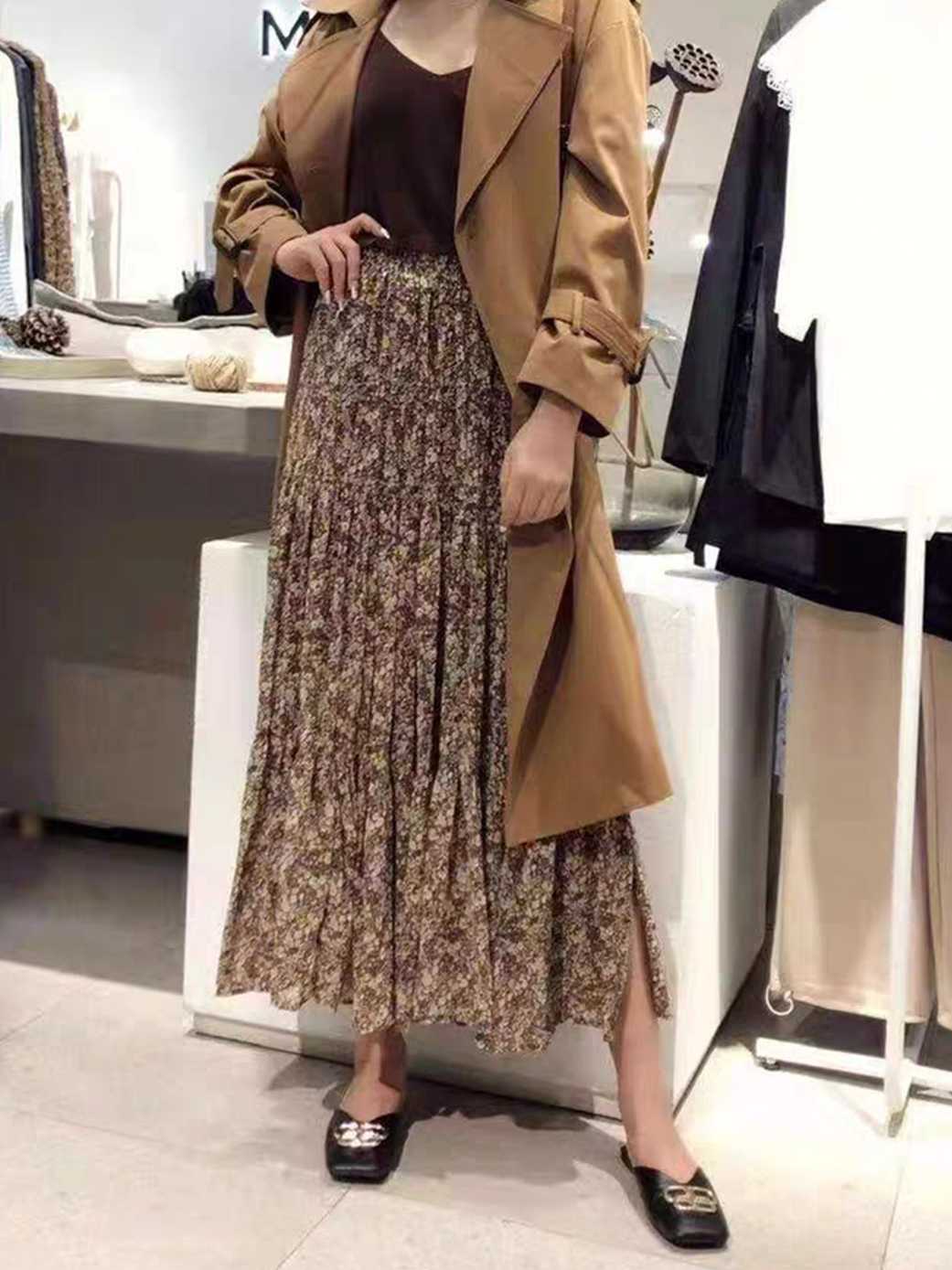 裙身布满植物碎花,在咖色底的衬托下,精致的画面都仿佛有了生机。