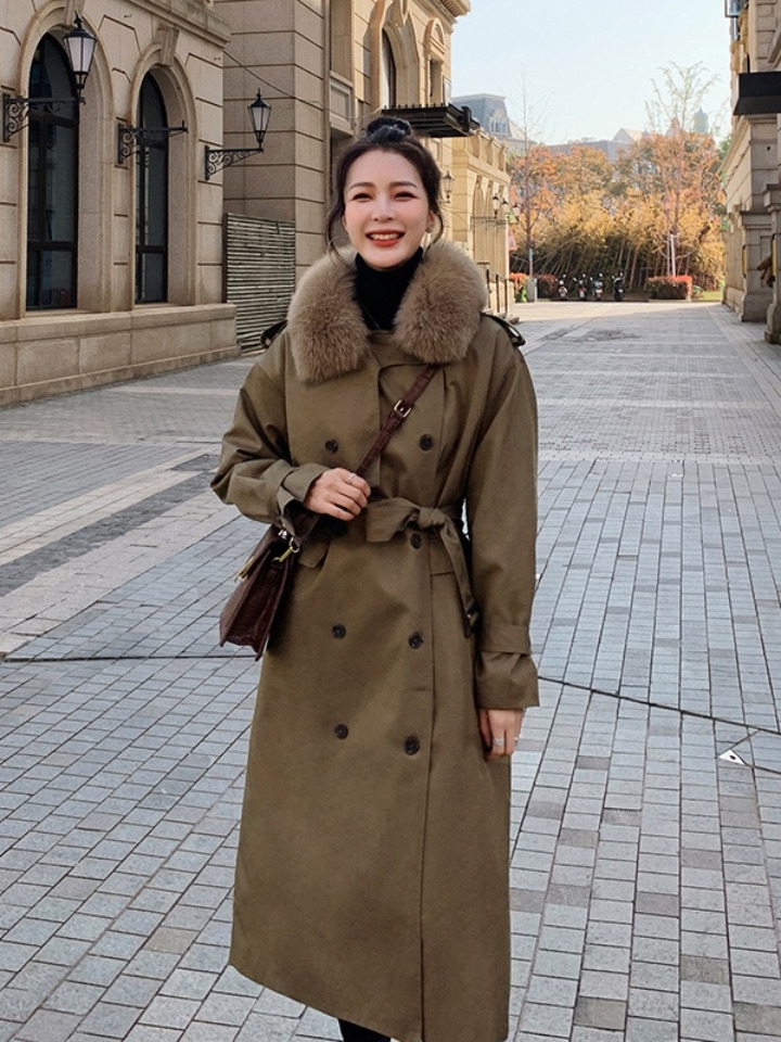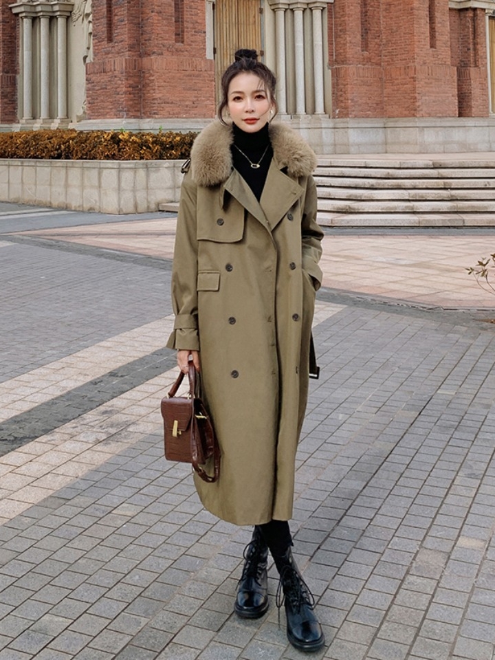 将经典的派克大衣中长款的版型变为了过膝的长款,内里夹棉使大衣更加的保暖,蓝色衣身搭配黑色的真毛毛领,撞色设计很有质感,上身也非常的帅气。