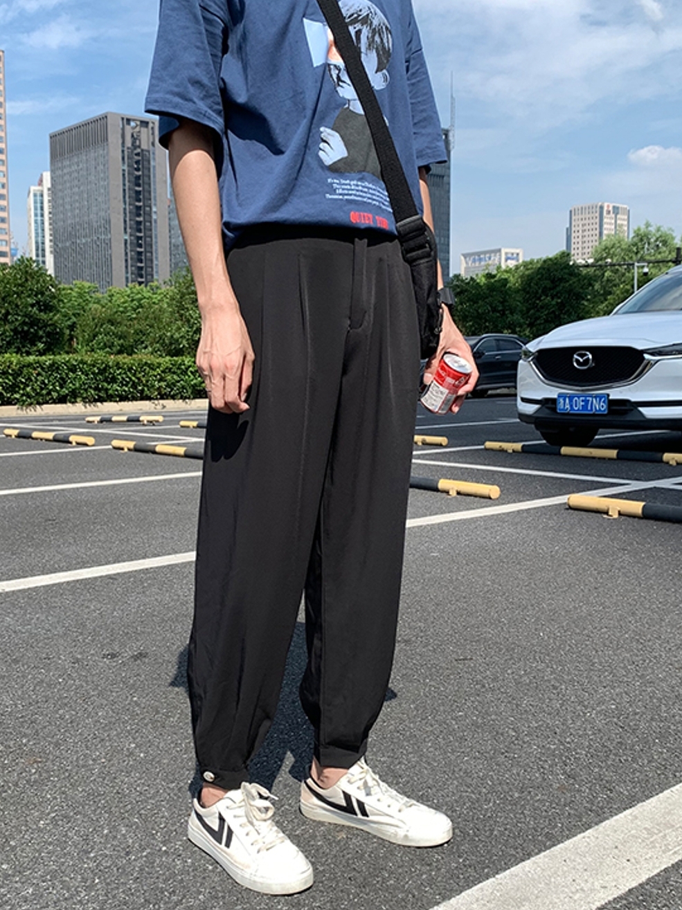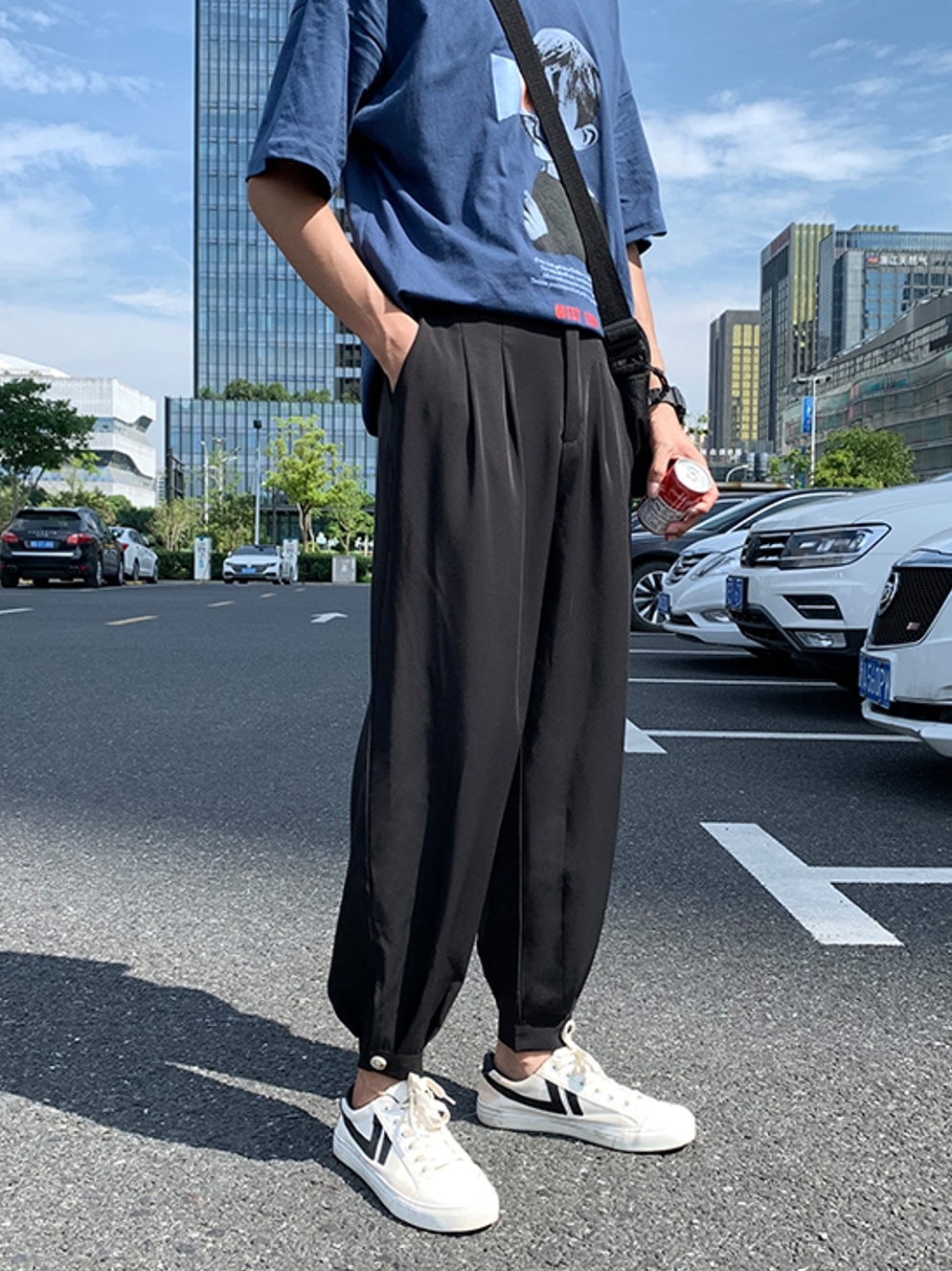 这款收脚裤比较宽松的版型设计,穿上身会比较舒服。宽松的版型加上优雅的黑色,也是十分好搭配衣服的。
