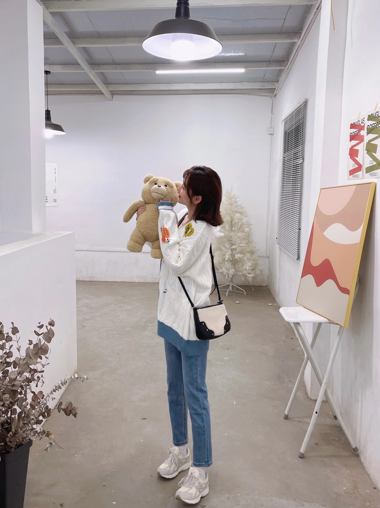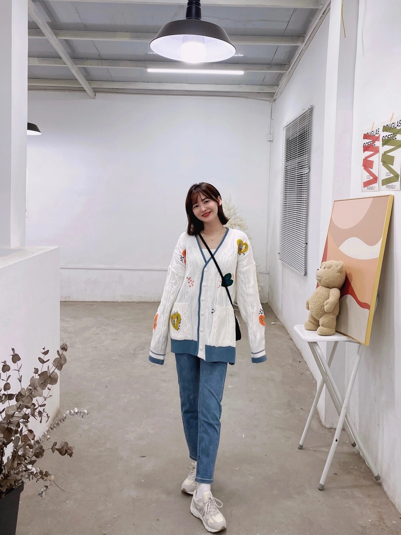下身搭配浅蓝色直筒牛仔裤就很好看,显高显瘦还甜美可爱,也可以搭配裙子,很甜美。