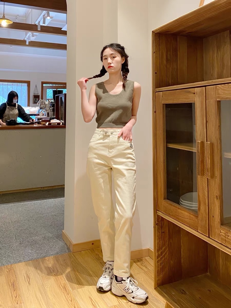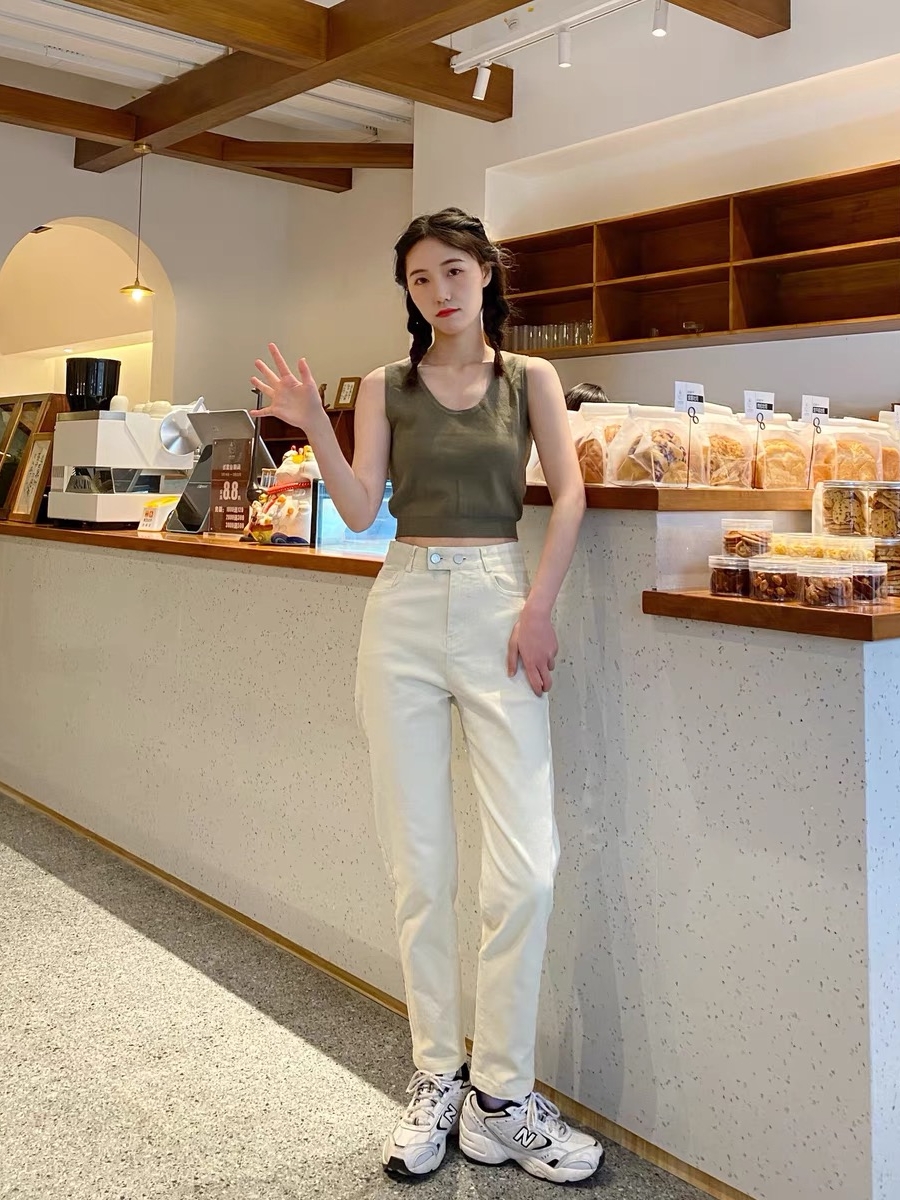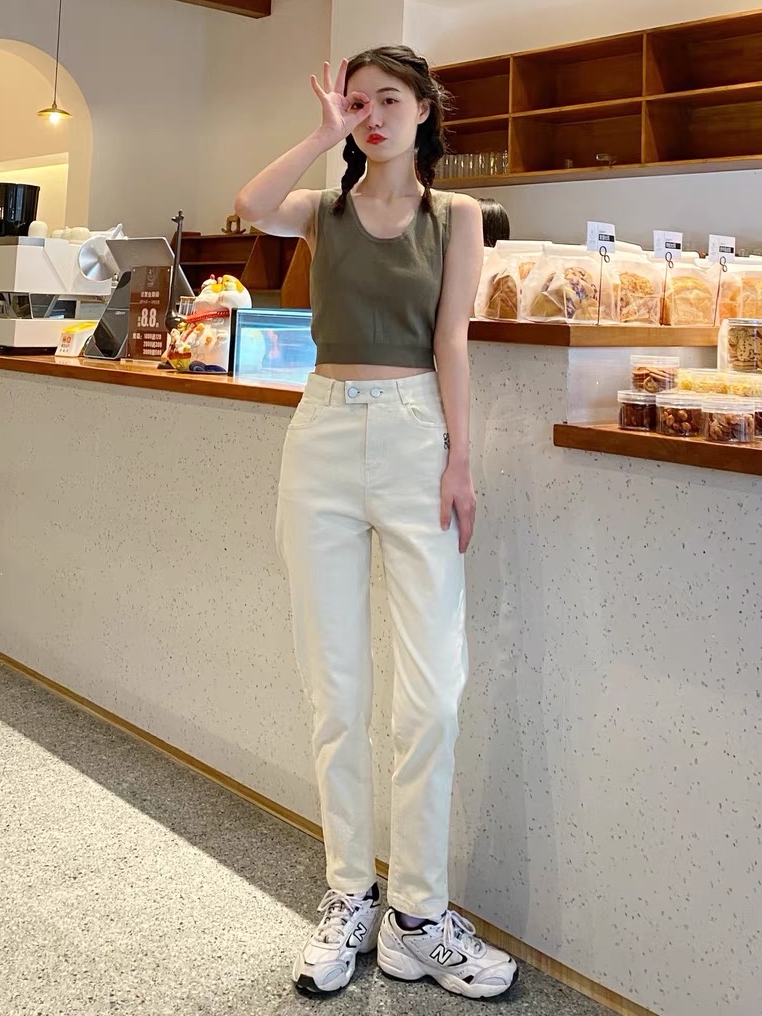 高腰设计,拉长身材比例。高腰牛仔裤,显瘦显腿长。直筒裤型,修饰腿部线条。