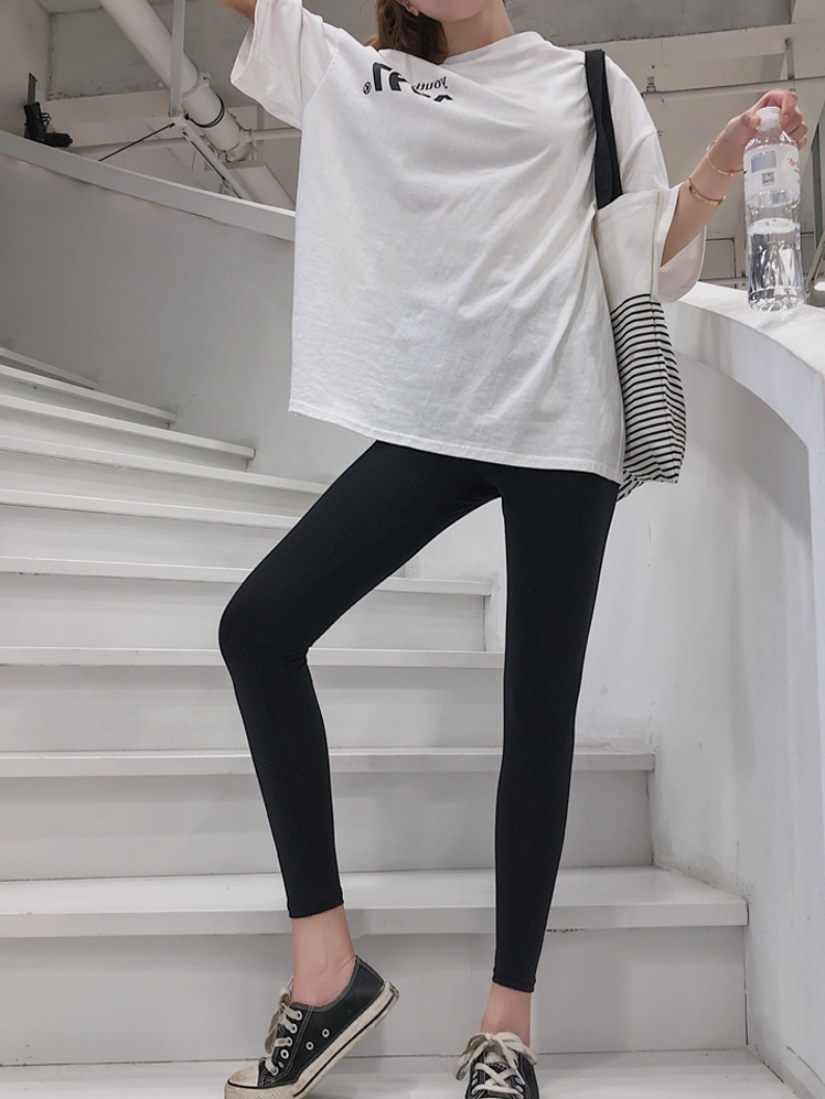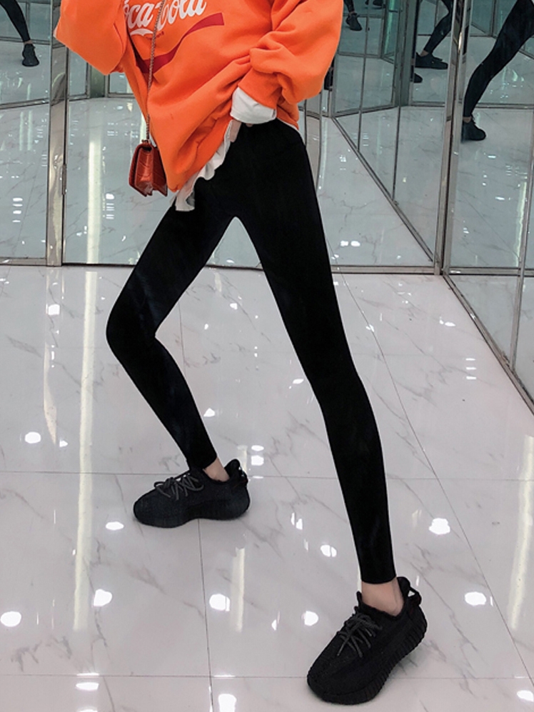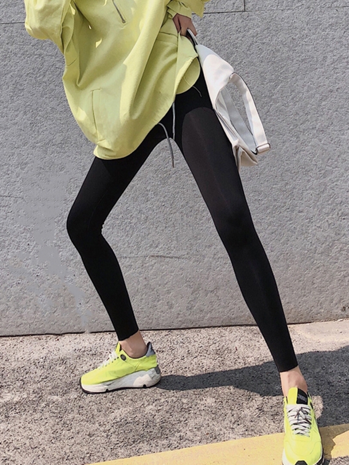 黑色弹力修身打底裤,线条利落的分割,优化腿部,视觉纤细显瘦,经典纯色元素,简约不失时尚感,彰显气质。