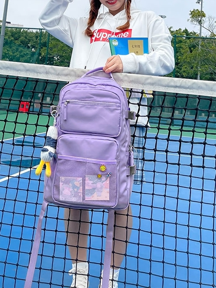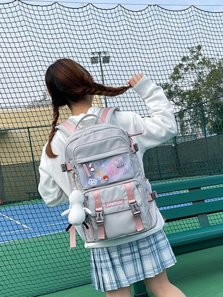 这款双肩背包的印花设计让这款双肩包的款式感还是很不错的,而且双肩包是很好搭配的单品而且也是很减龄的。