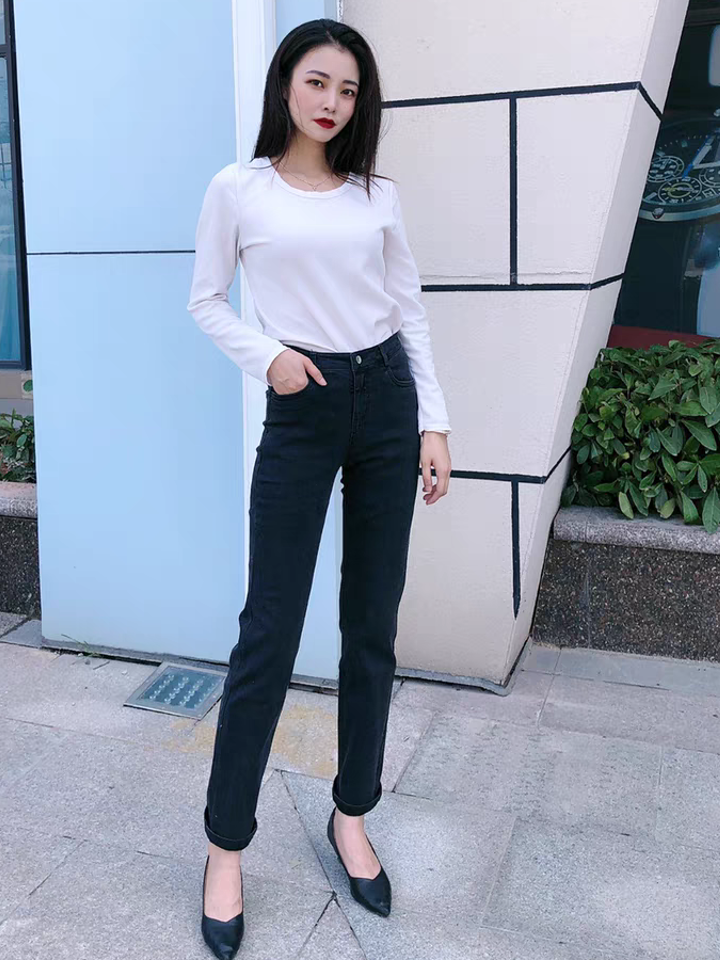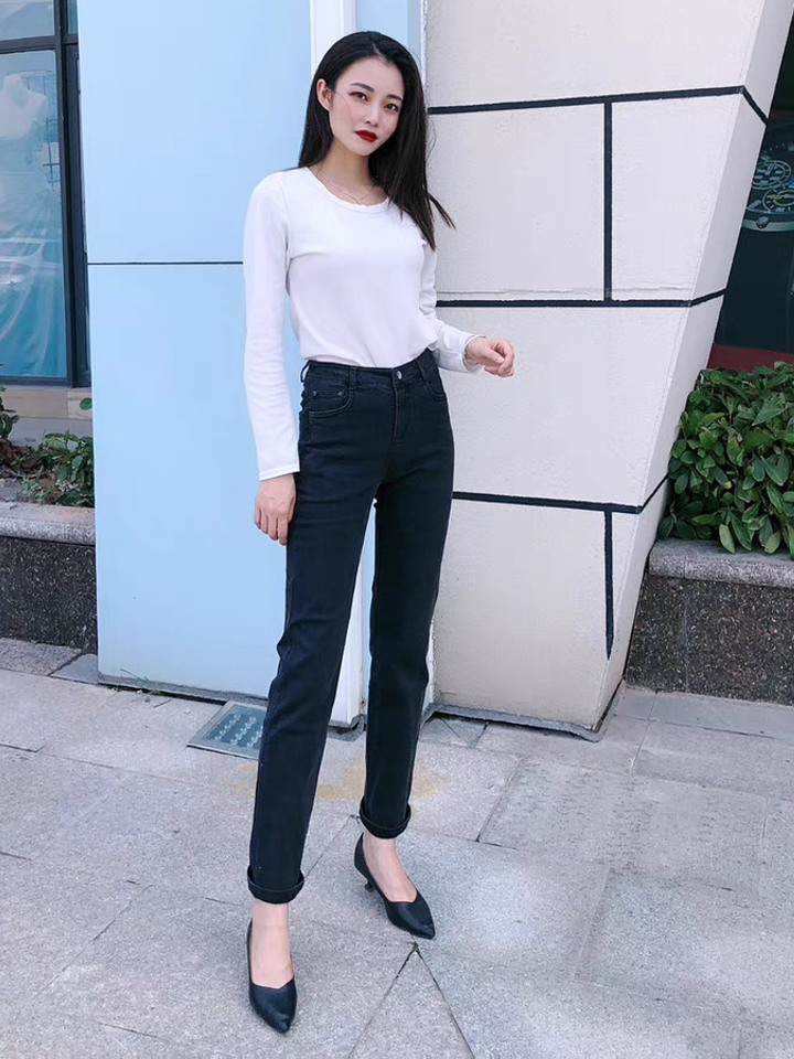 高腰设计,拉长身材比例。高腰牛仔裤,显瘦显腿长。直筒裤型,修饰腿部线条。