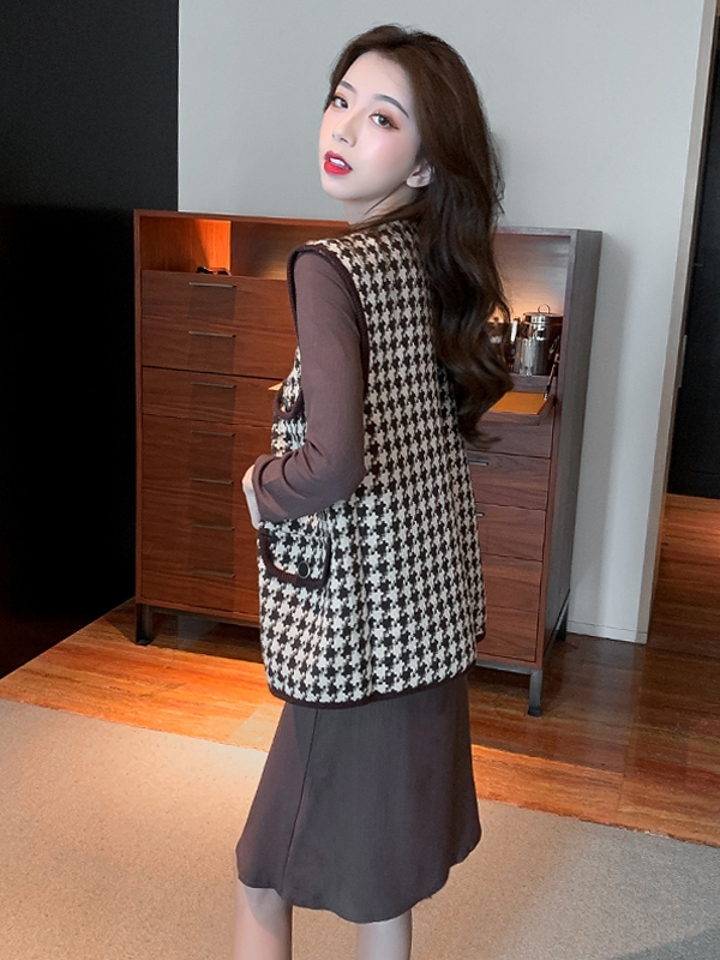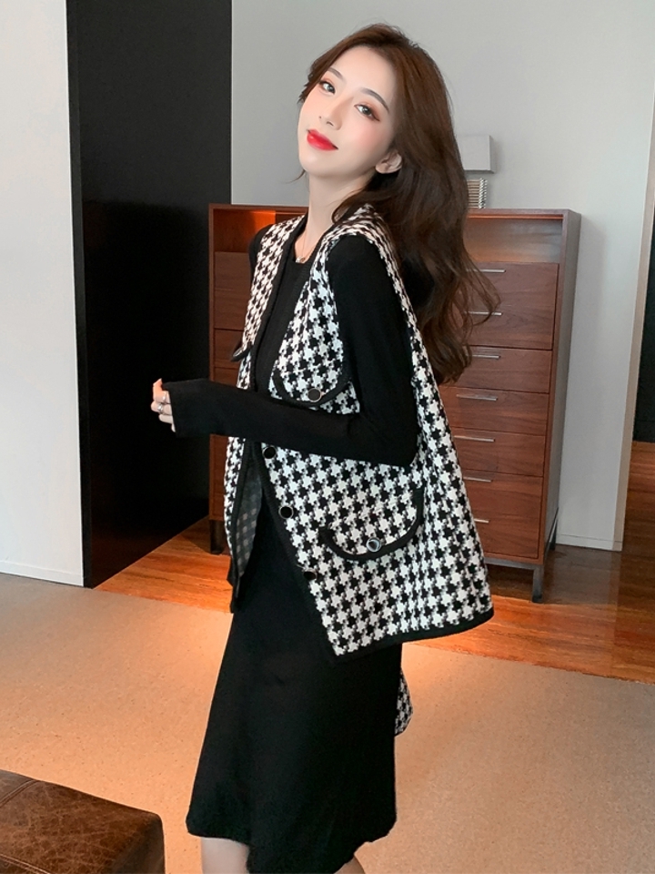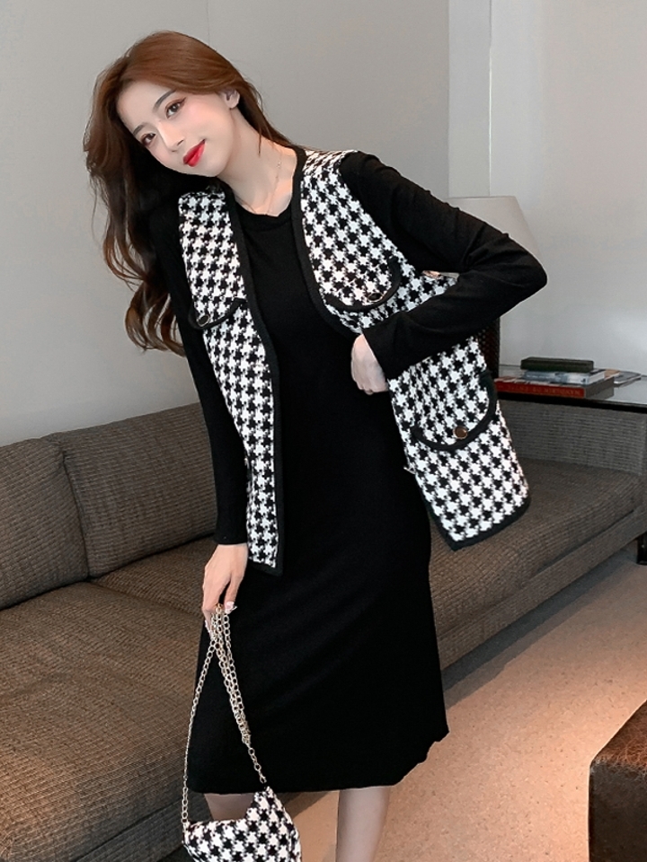 弹力针织面料质感非常好,上身非常显可爱年轻,简直就是装嫩无敌法宝单品,针织是非常显身材,很修身的类型,气质两件套,千鸟格针织绞花图案。