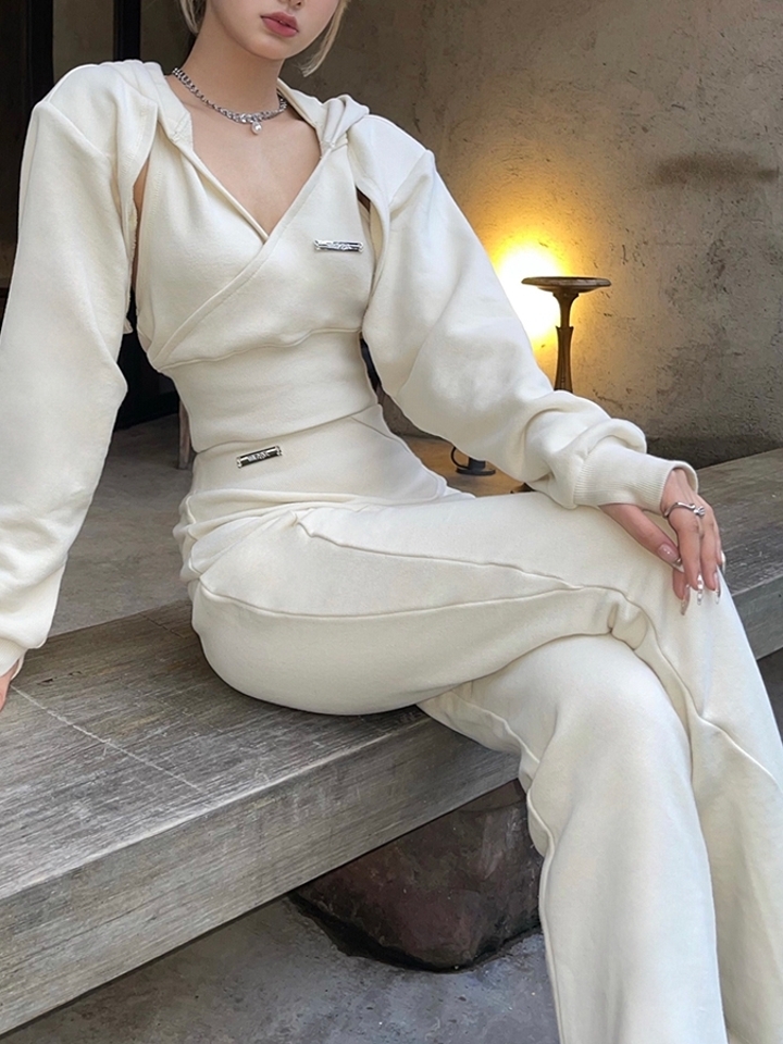 看似没有什么抢眼的设计亮点,却用恰当的简约与黑白的配色,展现出小婉约与小休闲的结合。V字的连帽衫,隐约展现出的挂脖流线,有着细腻的小性感,上下身呼应,打造出平衡的造型感,很有格调。