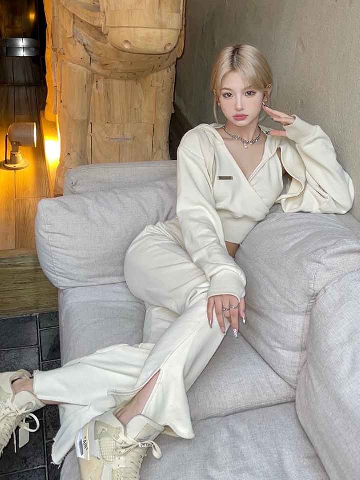 宽松舒适的一款卫衣套装,下身侧边条纹拼接,个性时尚,裤脚开叉设计随意有范,凸显街头潮味,上身所带给的就是在女人味上添了中性帅气风。