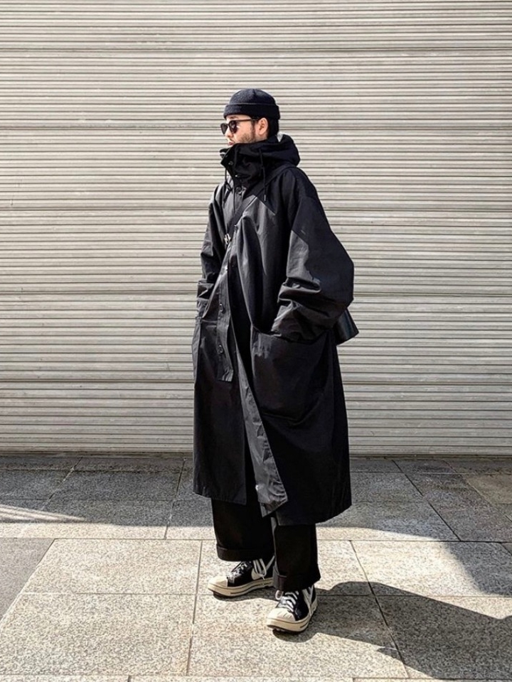 一款风衣式的长款外套,设计师挑选了两个颜色,一个是经典黑色,一个则是个性玫红。外套上增加了四个口袋拼接,使得服饰更有立体感。袖子则是螺纹收紧