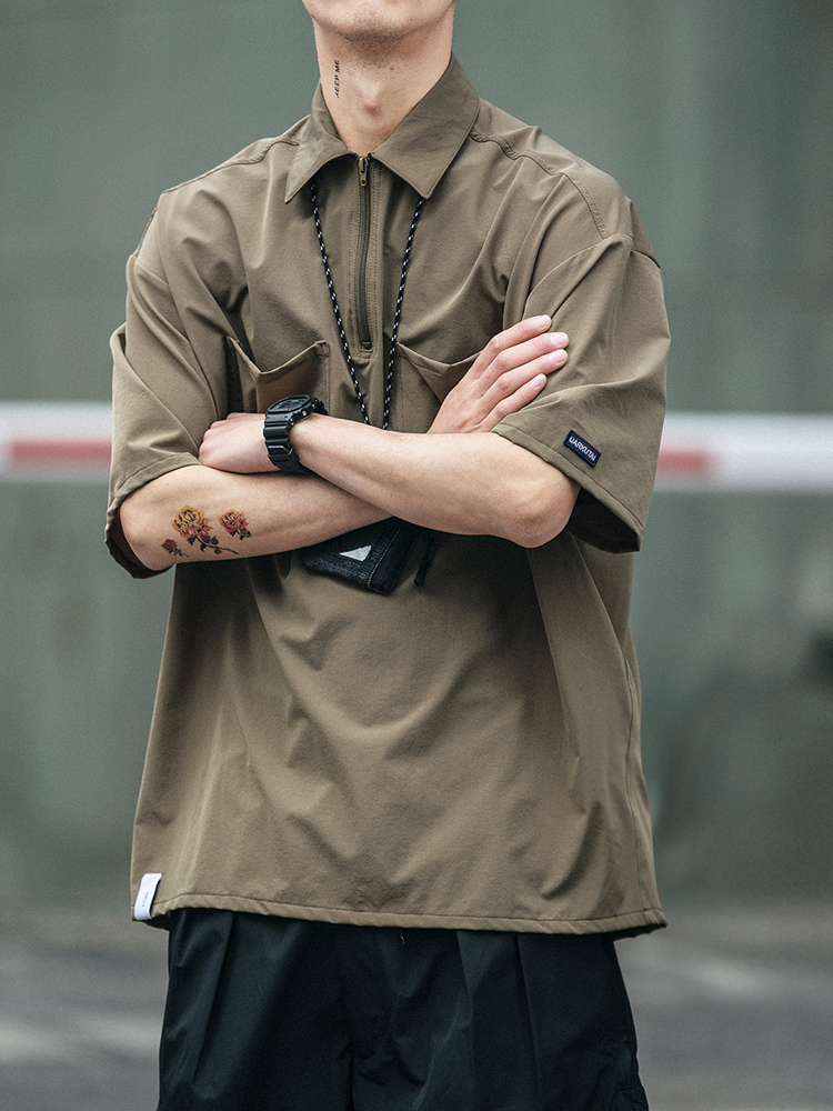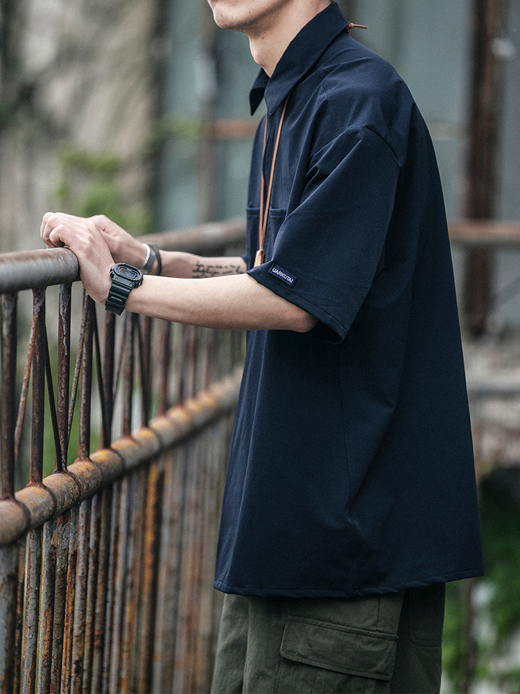 这款时尚的工装衬衫采用翻领设计,修饰颈部和脸部线条,简约帅气。时尚的落肩袖设计,舒适大方,帅气有型。修身的立体剪裁,贴合身形,勾勒出男性饱满挺拔的曲线。后摆微褶处理,增强整体的层次感。