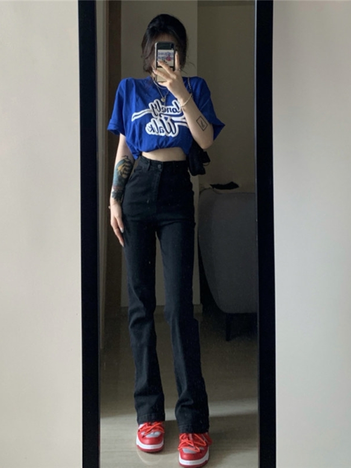 第一眼爱上的牛仔裤,很喜欢这样拼接渐变色的感觉,版型的话是用了直筒收脚的裤型,这条就是腿型不好的救星啊,膝盖上方是小宽松的。