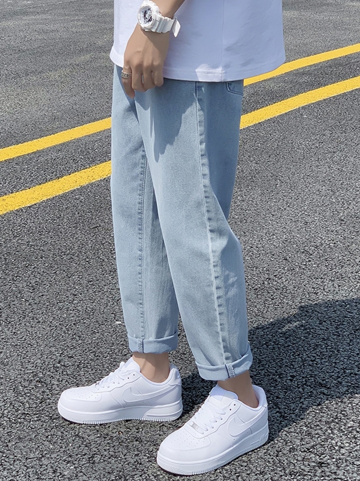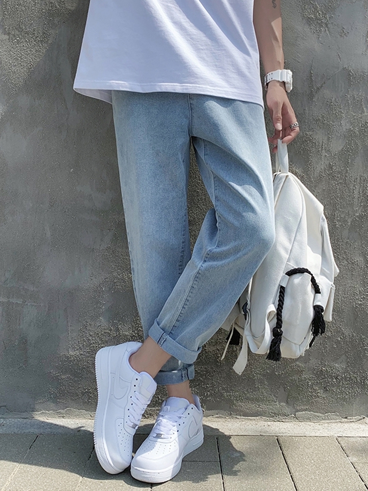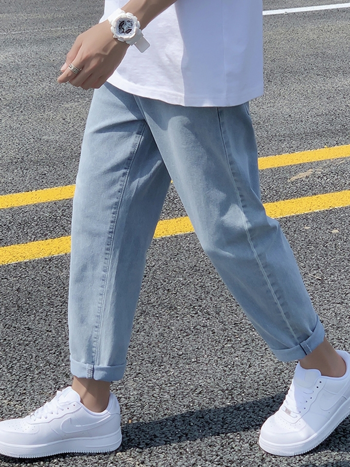 适合卷起裤脚穿的牛仔裤,看起来就很赞,加以简单的水洗工艺处理,完成了这样不见大的文艺小清新风格,卷起的裤管,露出脚踝,秀一把时尚潮流,就是这么简单