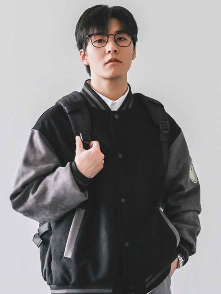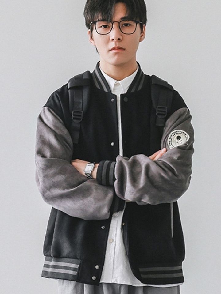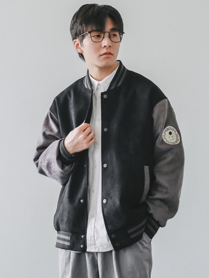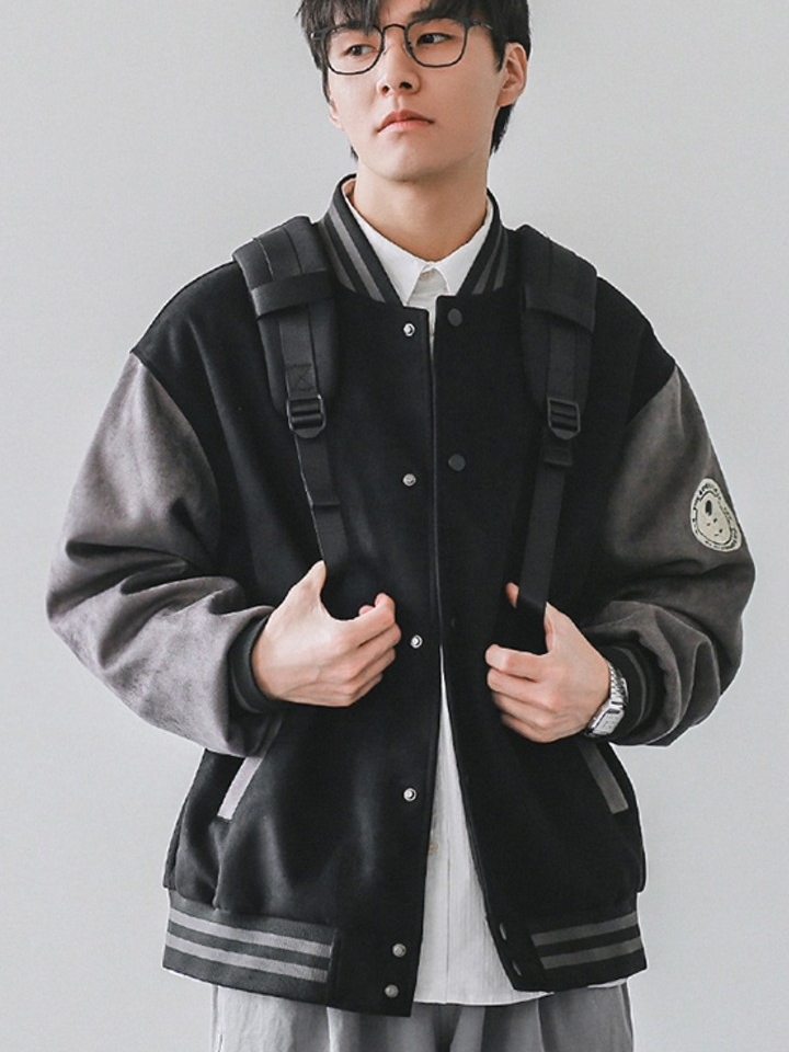 拼接棒球服总是带给人青春朝气的大男孩形象,本款棒球服前胸徽章精致耐看,金属按扣赋予质感新贵气质,背后骑士图案个性可爱,袖口和下摆采用螺纹收口。