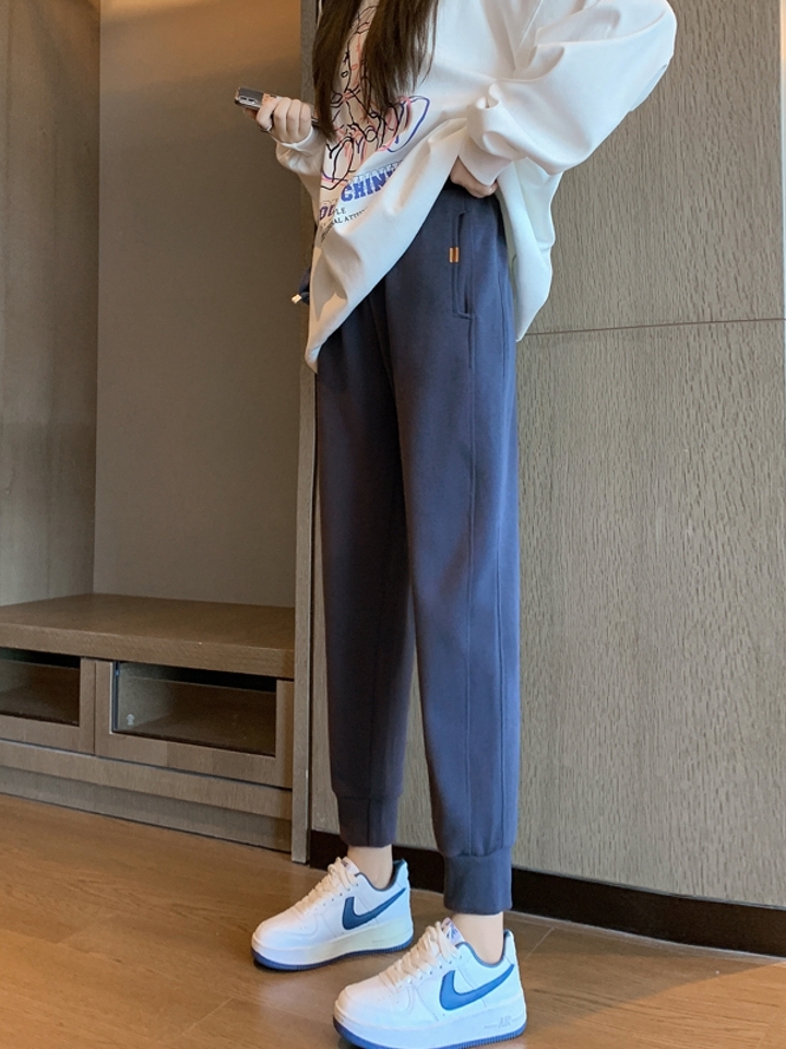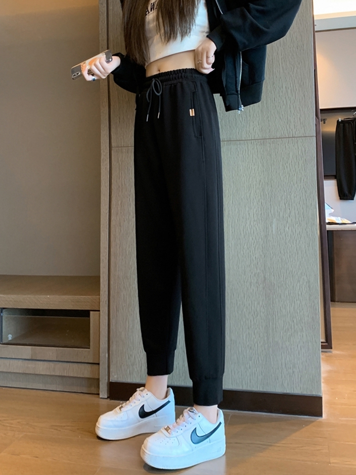 这款运动休闲气息十足的卫裤,经典的纯黑色,让冬季的穿搭更加的百搭,给寒冬臃肿的穿着带来更多的时尚可能性,松紧抽绳腰头,与螺纹收窄裤脚是呼应的。