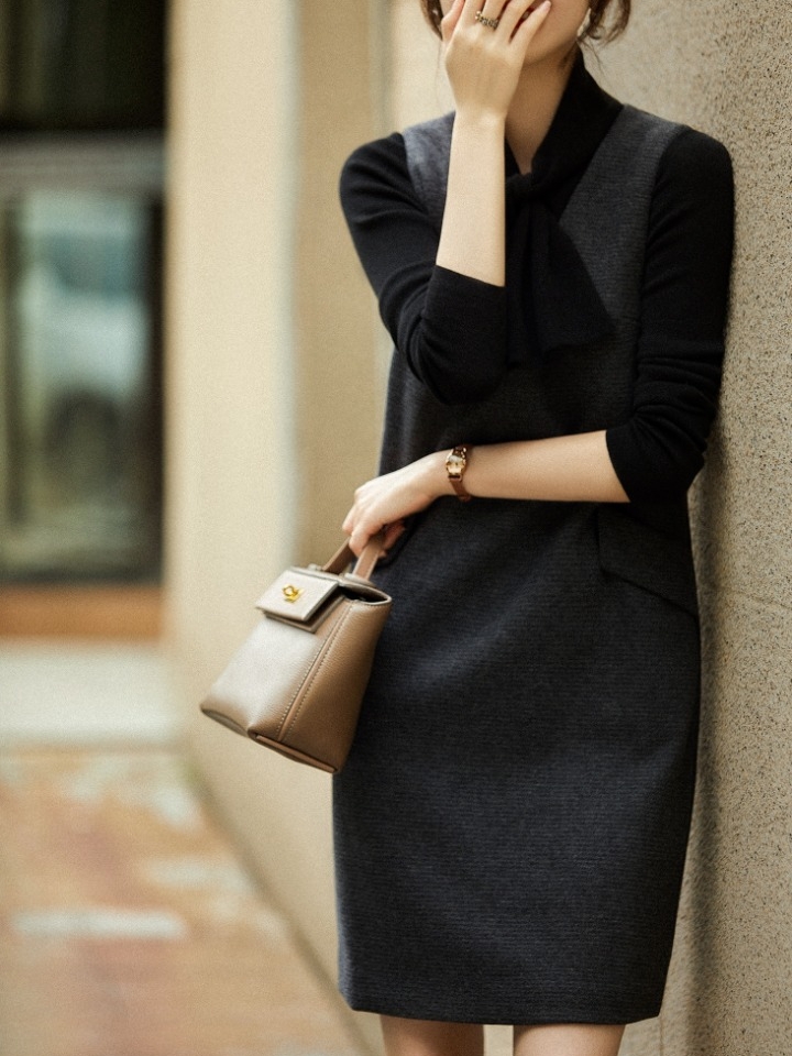 赫本风优雅神秘的小黑裙,散发出女性性感与妩媚的风情。一字圆领造型美观贴合,秀出迷人的锁骨线条与傲人的天鹅颈。收腰百褶裙型,端庄大方,女神范十足。搭配黑色高跟鞋和白色链条斜挎包,时髦摩登的气息呼之欲出。