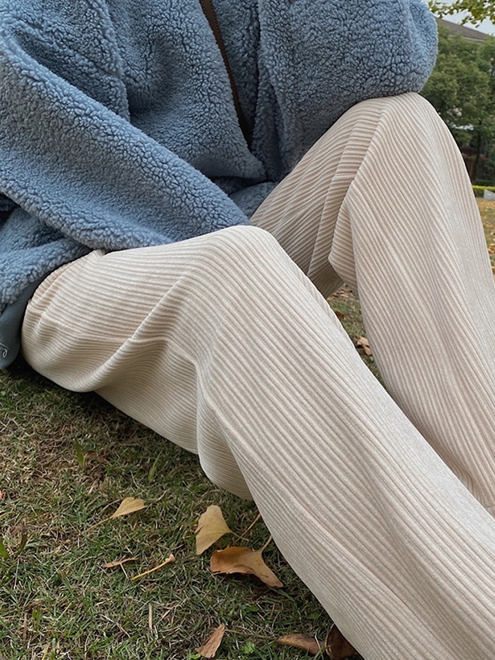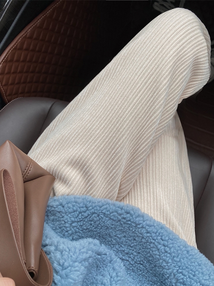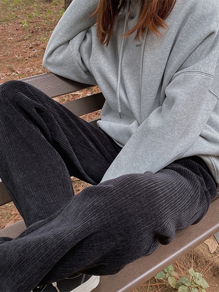 灯芯绒面料,带有丝丝光泽感,超级舒适,宽松的裤腿结合竖条斜条纹理,修饰腿部线条,超级显瘦哦,特别适合秋冬穿。