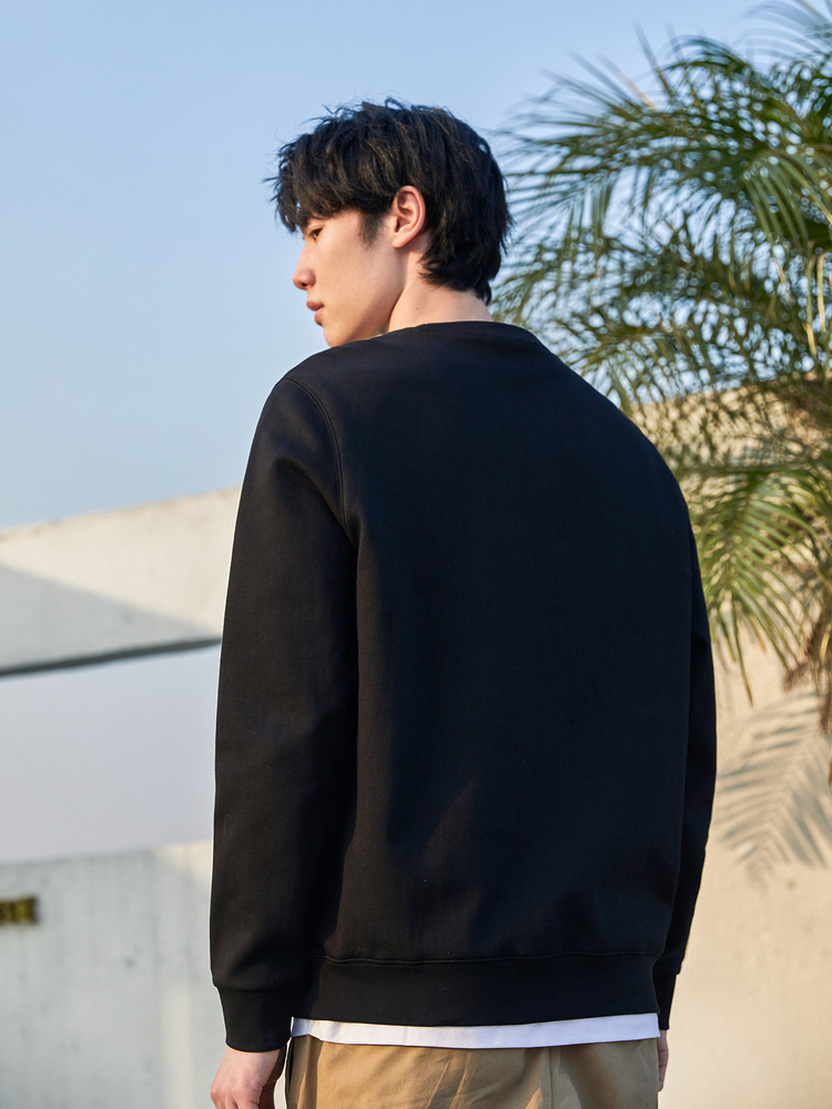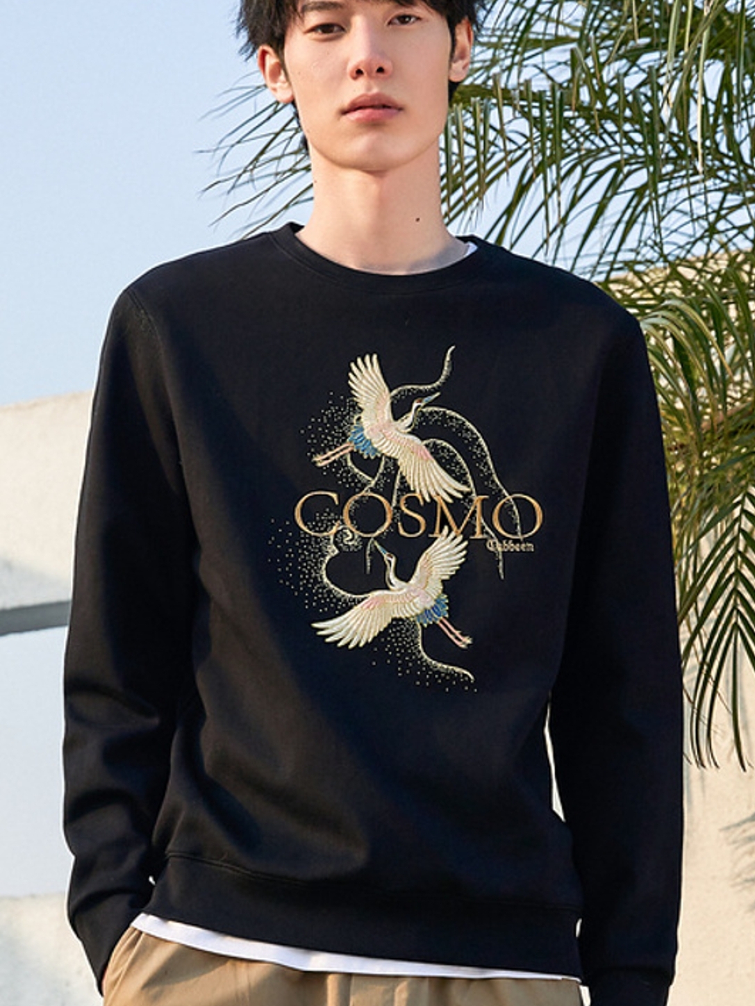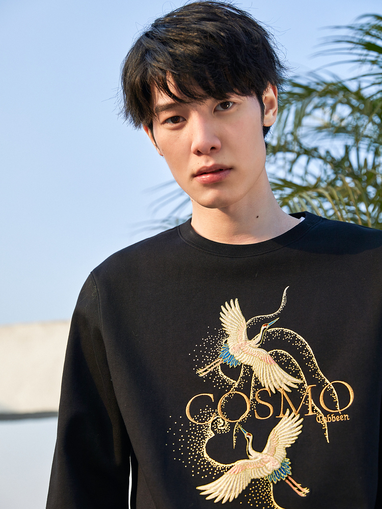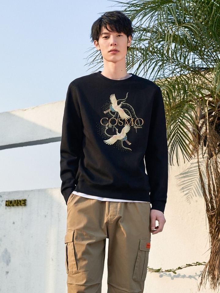 衣身下摆的两只仙鹤图案,辅以精致的刺绣工艺呈现,为单调的卫衣款式带来了更多的层次感与设计感,极具复古腔调;辅以黑色做底,更具个性中国风气息;质感面料的选择,让穿着更加舒适。