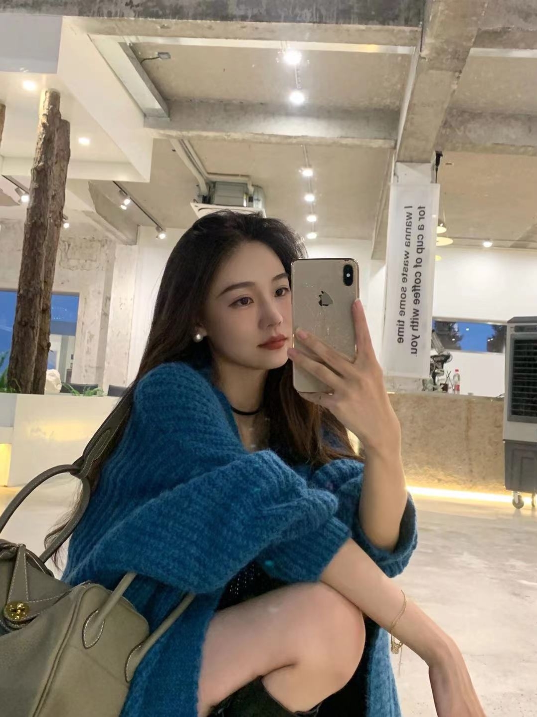 毛衣的长度是中长款,里面内搭无论搭配什么都非常适合,蓝色也能在秋天很扎眼。
