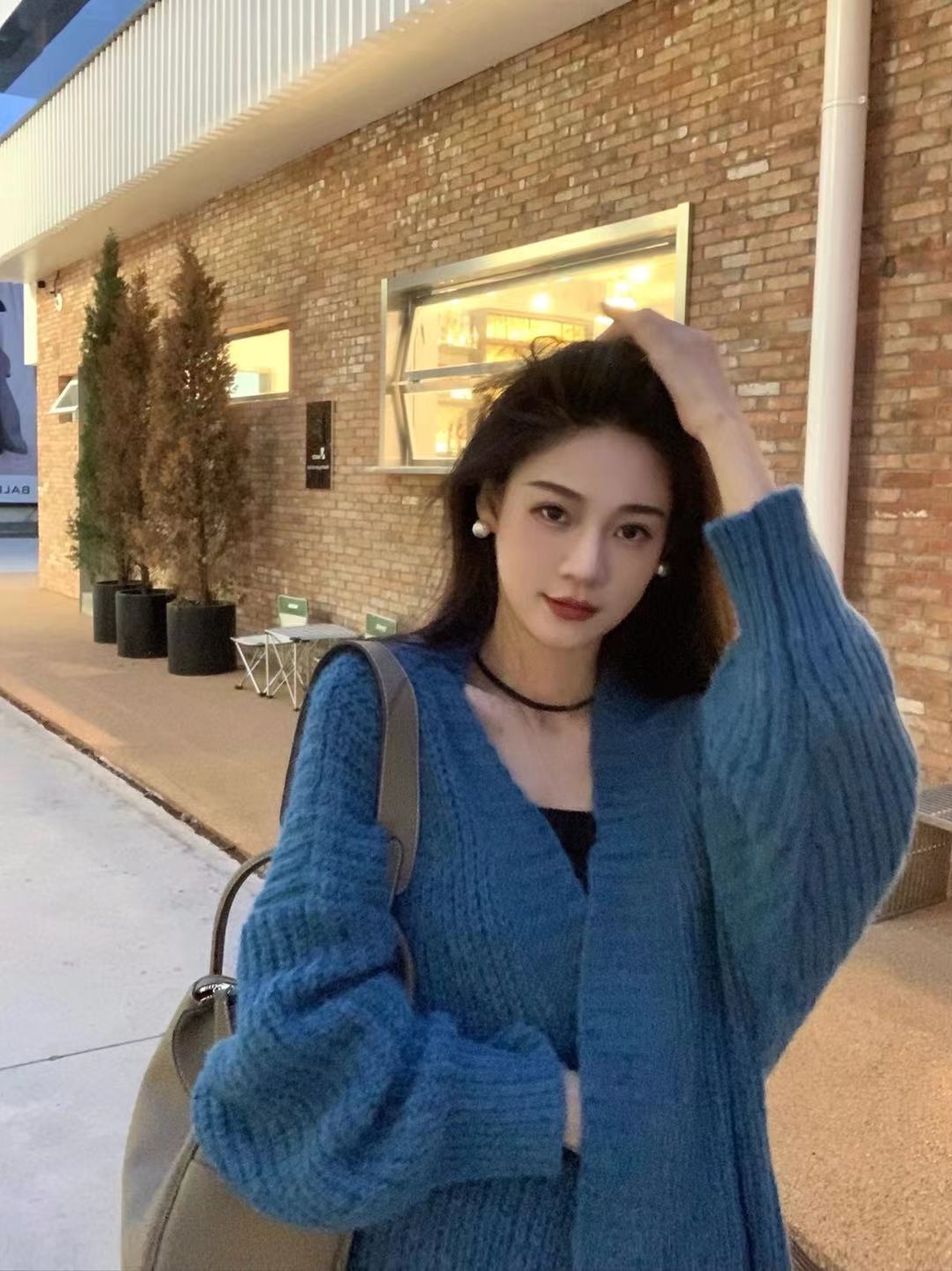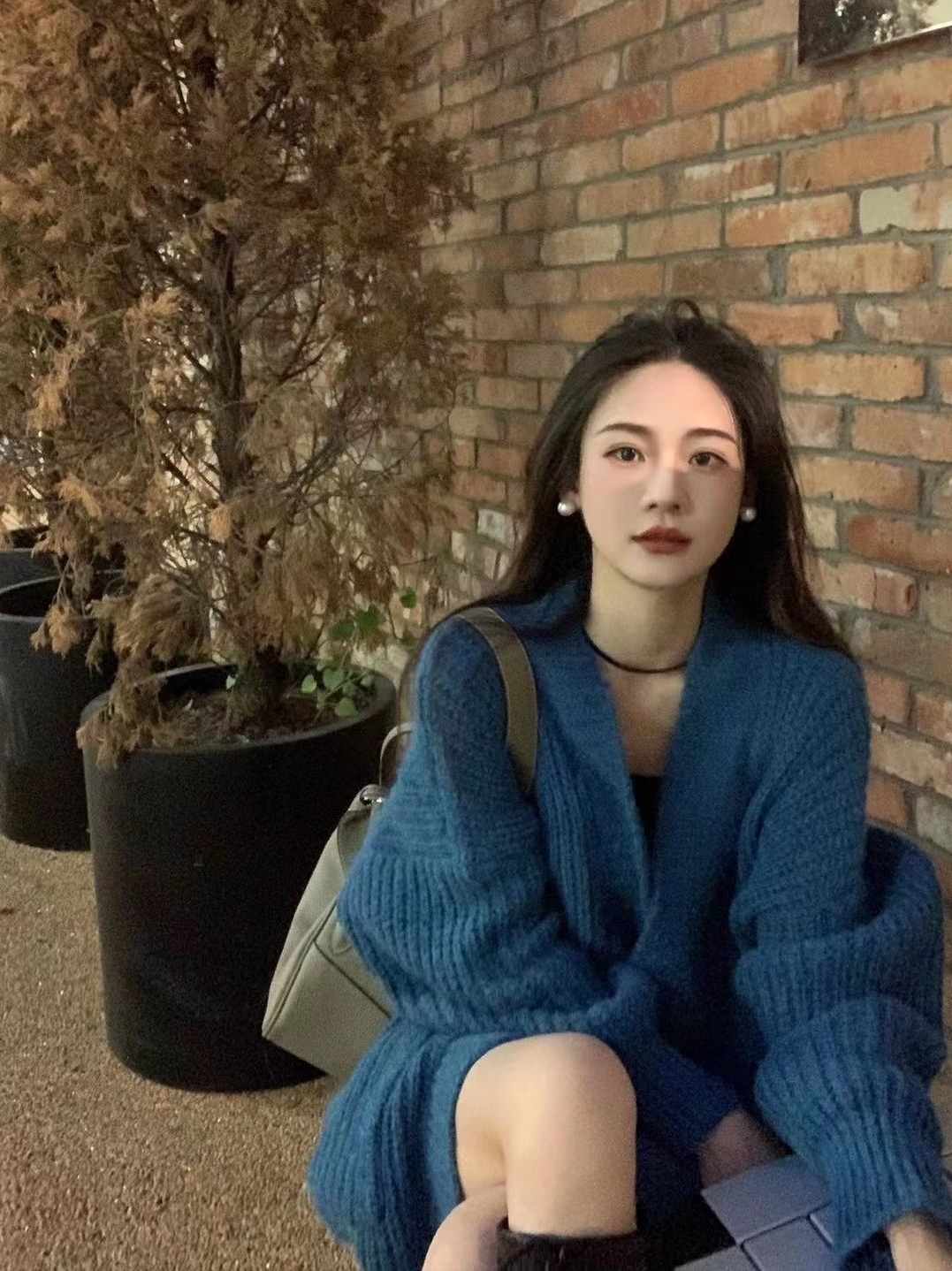 早秋傍晚的蓝色针织大开衫,慵懒风毛衣真的是太适合秋天啦,气质满满。
