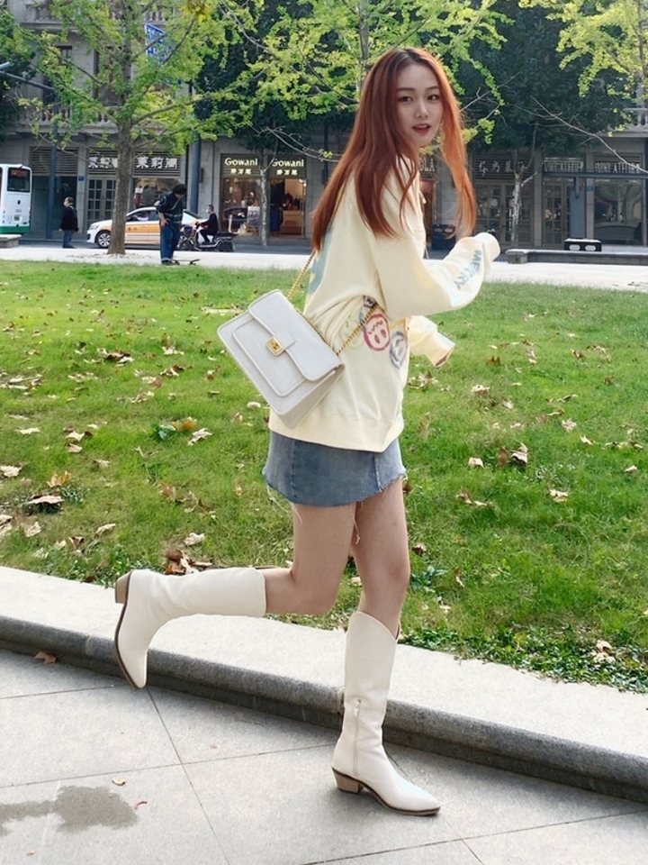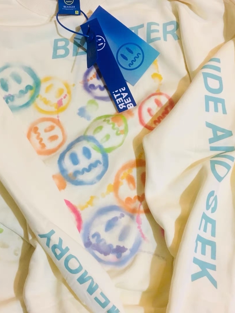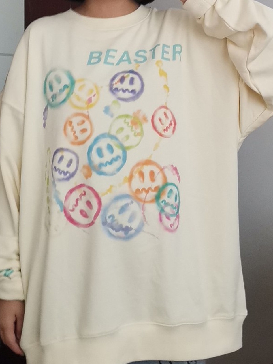 圆领卫衣,宽松大气,张力十足。印花图案,立体又轻柔,尽显青春气息,使原本单调的衣身变得丰富有趣,搭配一件牛仔短裙也是非常不错的。