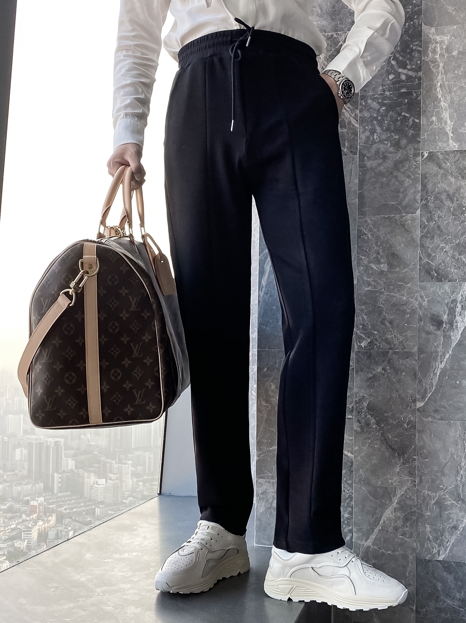 简约的高腰设计,搭配上修身的版型,上身显瘦又显高。