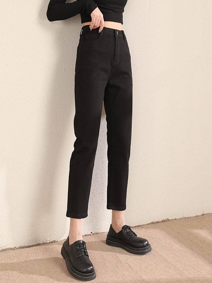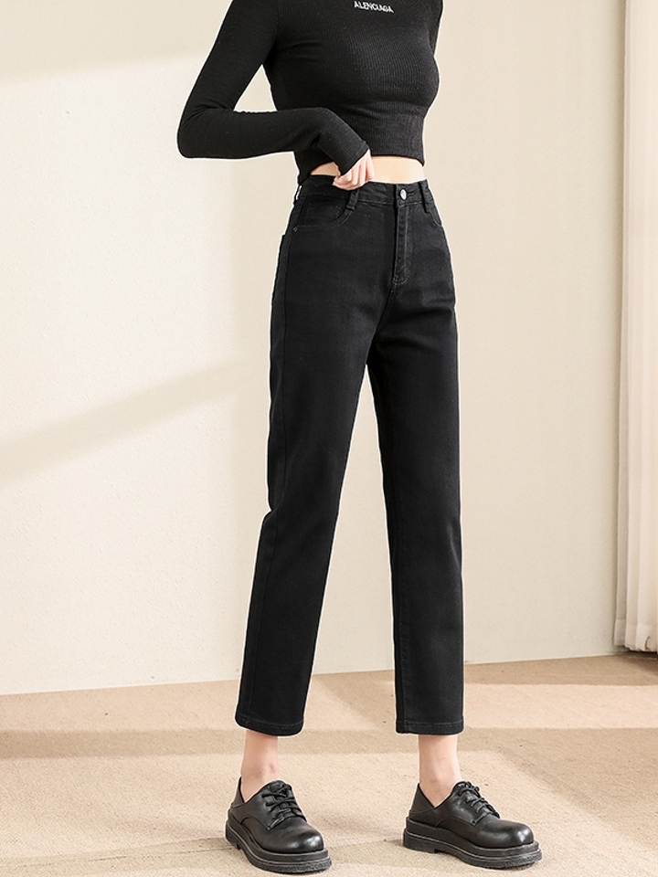 高腰设计,拉长身材比例。高腰牛仔裤,显瘦显腿长。直筒裤型,修饰腿部线条。