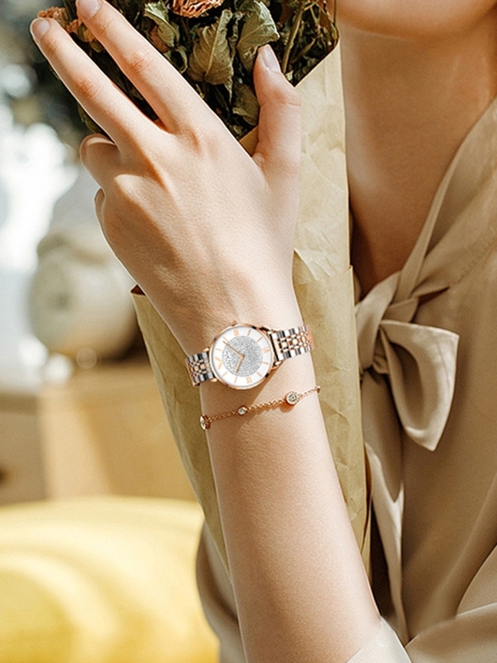 这款韩版时尚潮流防水手表,简单的搭配给人不一样的时尚效果。镶钻的满天星表盘,摩登时髦,与有着金属的质感,满天星表链相搭,映衬出腕表的柔美线条。