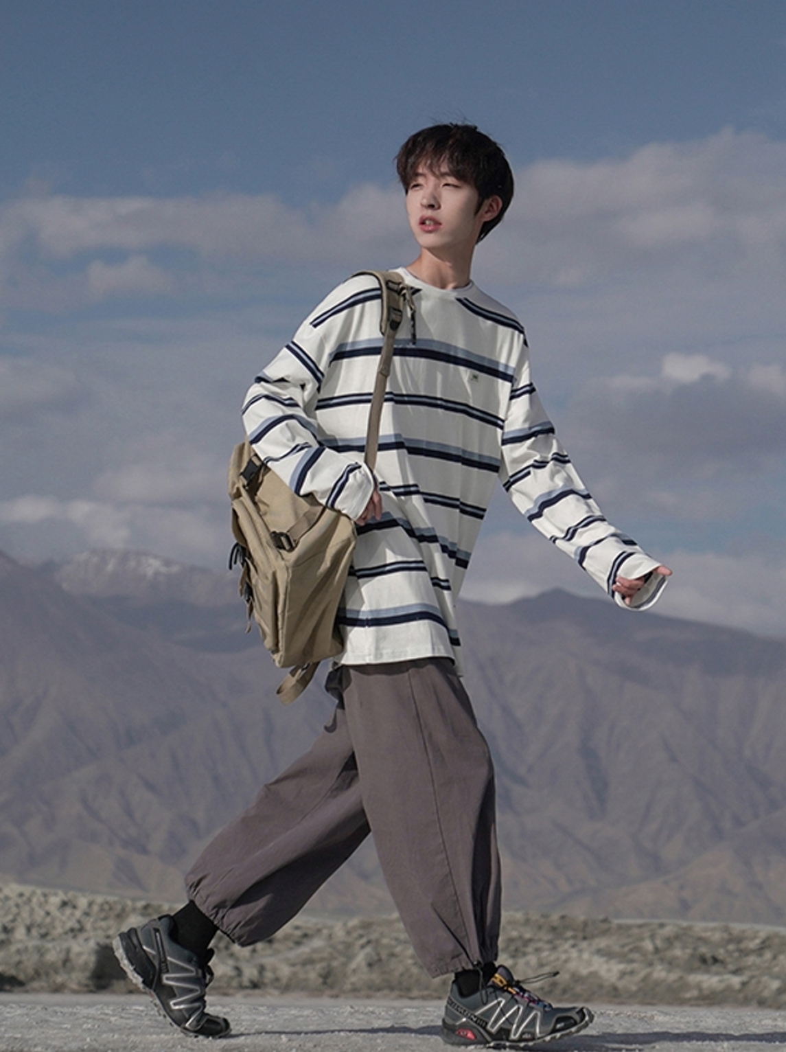 条纹元素与圆领经典元素的结合,整体简约大气又不失细节美感,撞衫几率为零。简约小落肩的版型,不挑身材,巧妙遮肉,搭配裙装、裤装都OK。印花棉布面料,舒适亲肤,秋季很实穿。