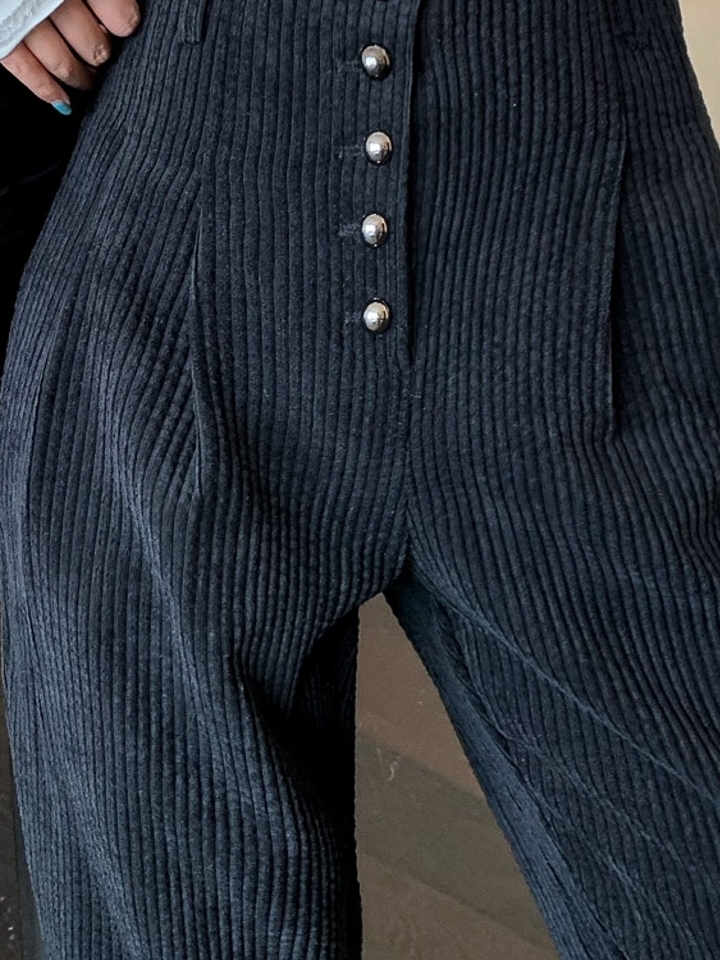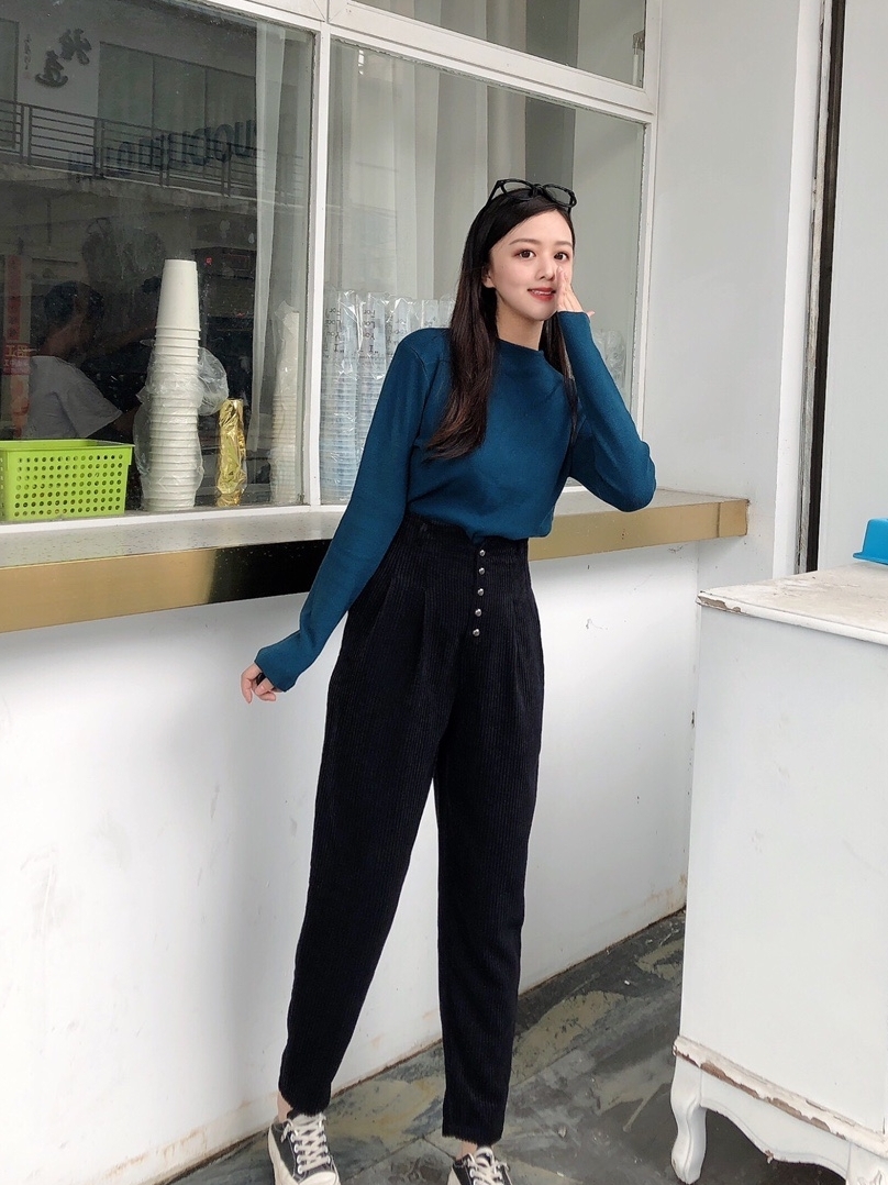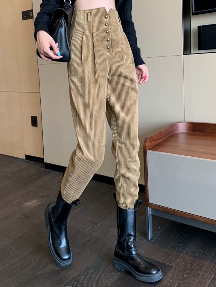 灯芯绒作为一种复古时尚元素越来越被人们青睐纯色简约大方,好搭衣服,腰头锁边的细节处理提升了整体质感,两侧插袋隐蔽使用,而后侧的三角标很好的点缀了整片纯色。