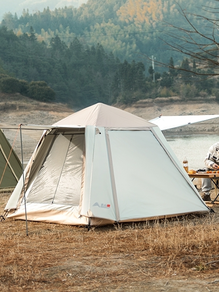 户外防暴雨速开帐篷,外帐采用优质210D涤纶面料,配合覆膜处理,具备极强的防水透气性能;铝合金支架处理,免搭建设计,使用更加的方面;离地防潮,美观别致,能让你的户外之行更加个性舒适。
