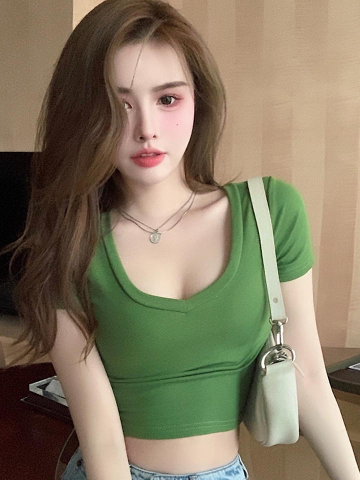 复古独特卷边设计, 俏皮性感。 短款露脐 ,棉质弹性大, 修身紧身。 夏季必备百搭纯色T恤