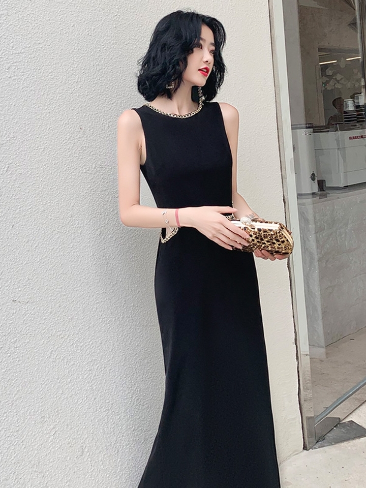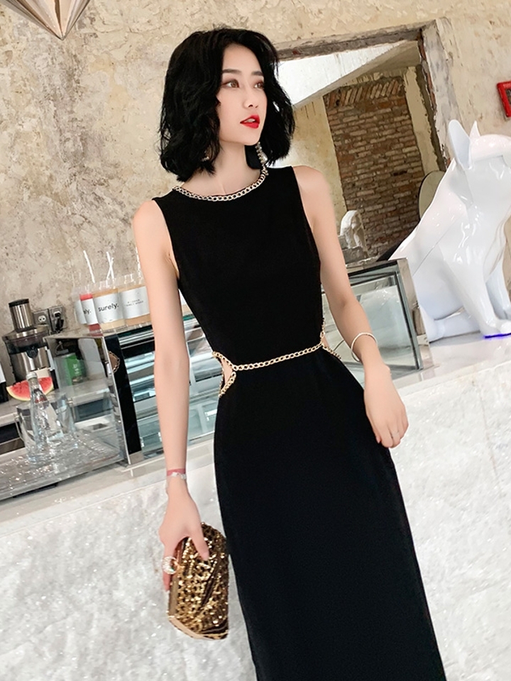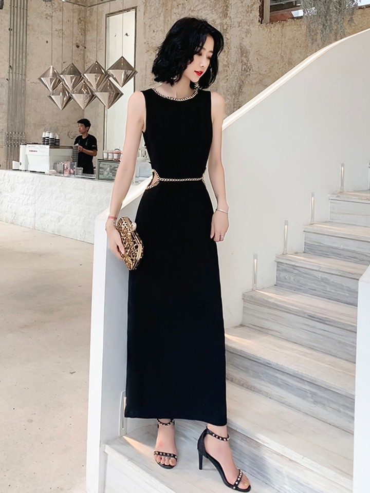无袖显瘦气质连衣裙,偏礼服的款。无论是出行宴会还是参加派对都很合适。经典的圆领,简单大气。黑色的基调,视觉上很显瘦的感觉。高开叉的设计,美丽的双腿若隐若现。简单的搭配一双高跟鞋,美极了。