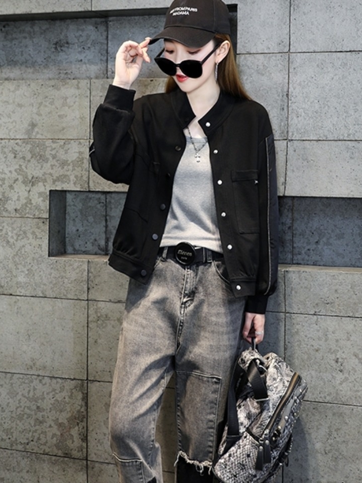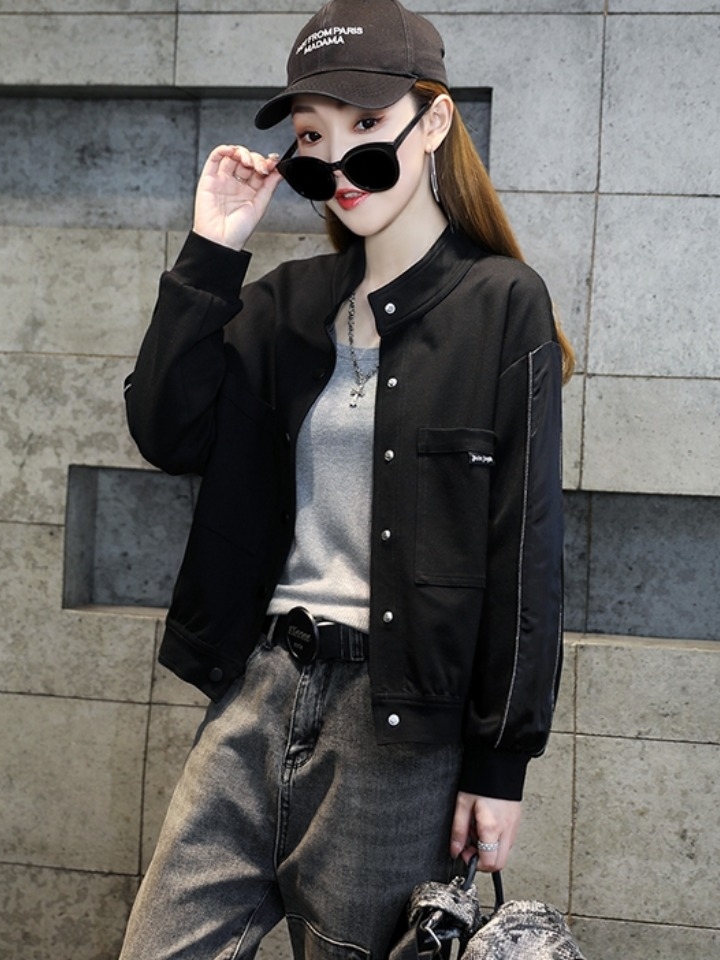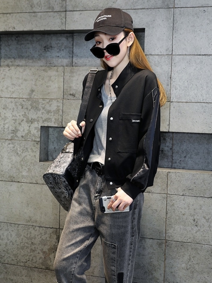 青春学院风的一款短外套,棒球服的款式设计,增添运动的活力和朝气,短款的版型,拉长身材比例,内搭卫衣、T恤单品,都很时髦减龄。