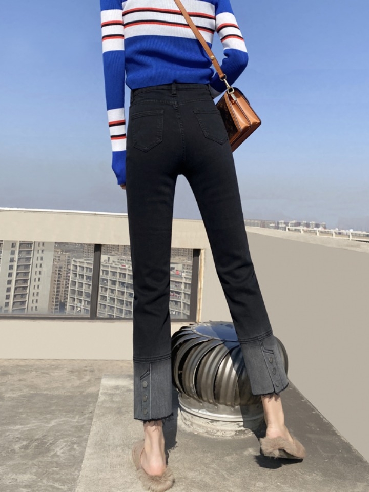 休闲小脚裤,高腰小脚裤版型,时尚高腰设计,拉长身形,显瘦显腿长,前身纽扣拉链开襟门身,方便穿脱,两帅气插袋,方便实用,水洗牛仔面料,清新休闲百搭