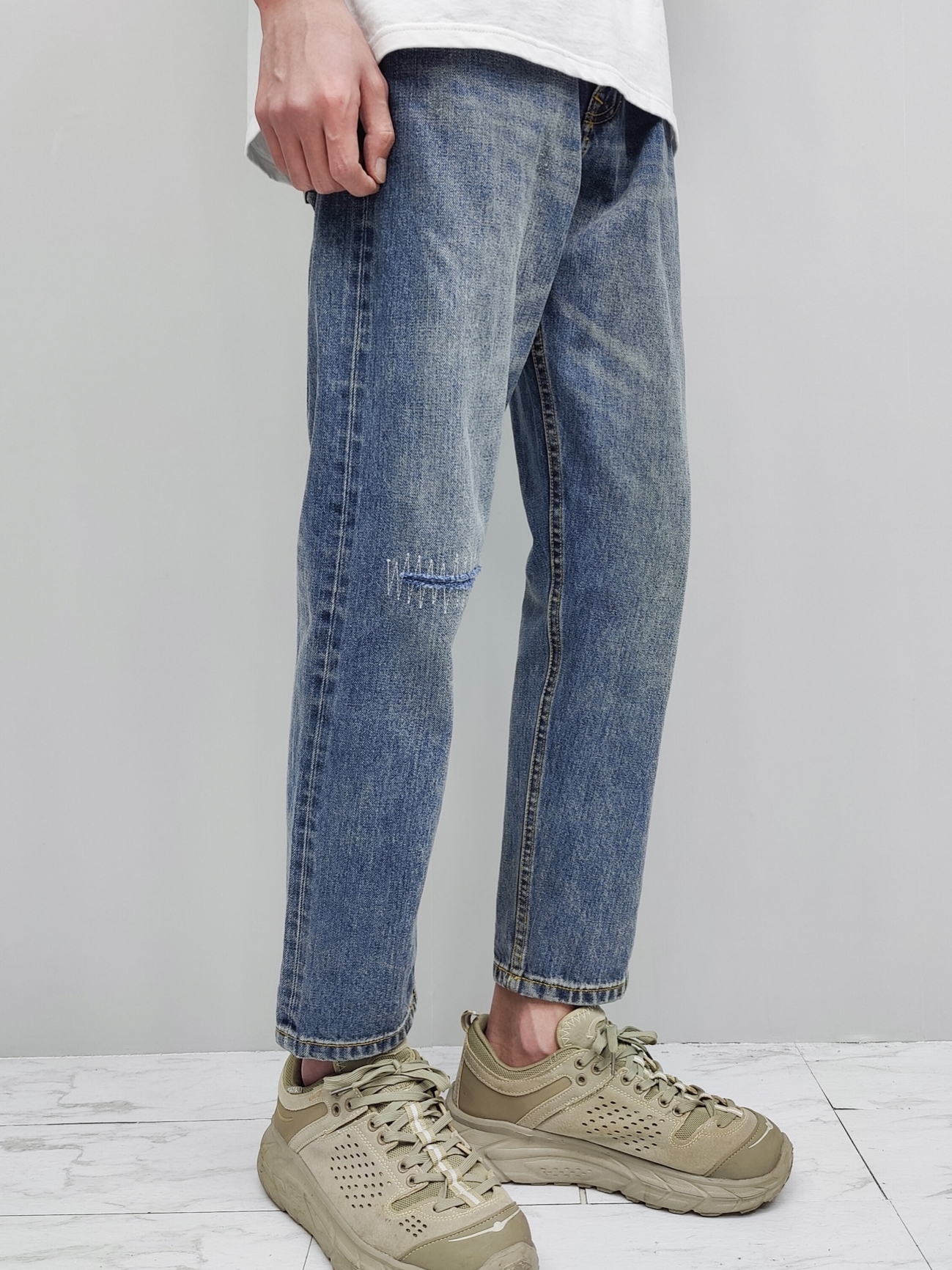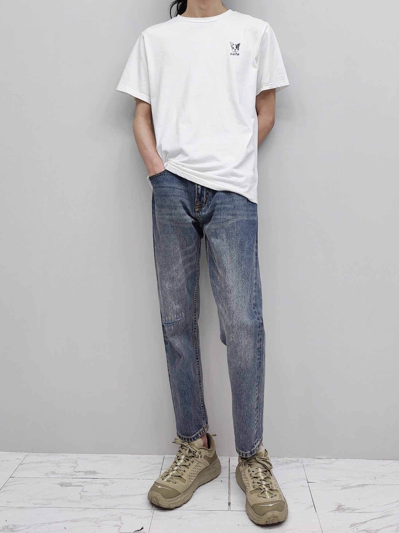 基本的九分款式,随性自然,日常穿着更显气质。深蓝色有修饰腿型的效果,九分的裤长利落有型,做了自然的毛边设计,彰显随性与不羁