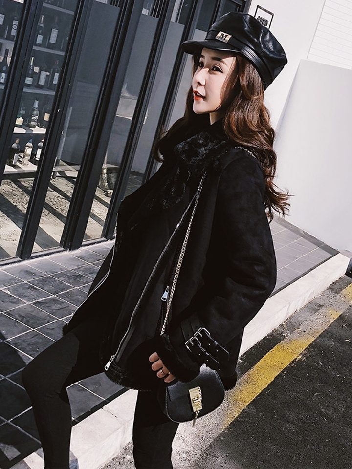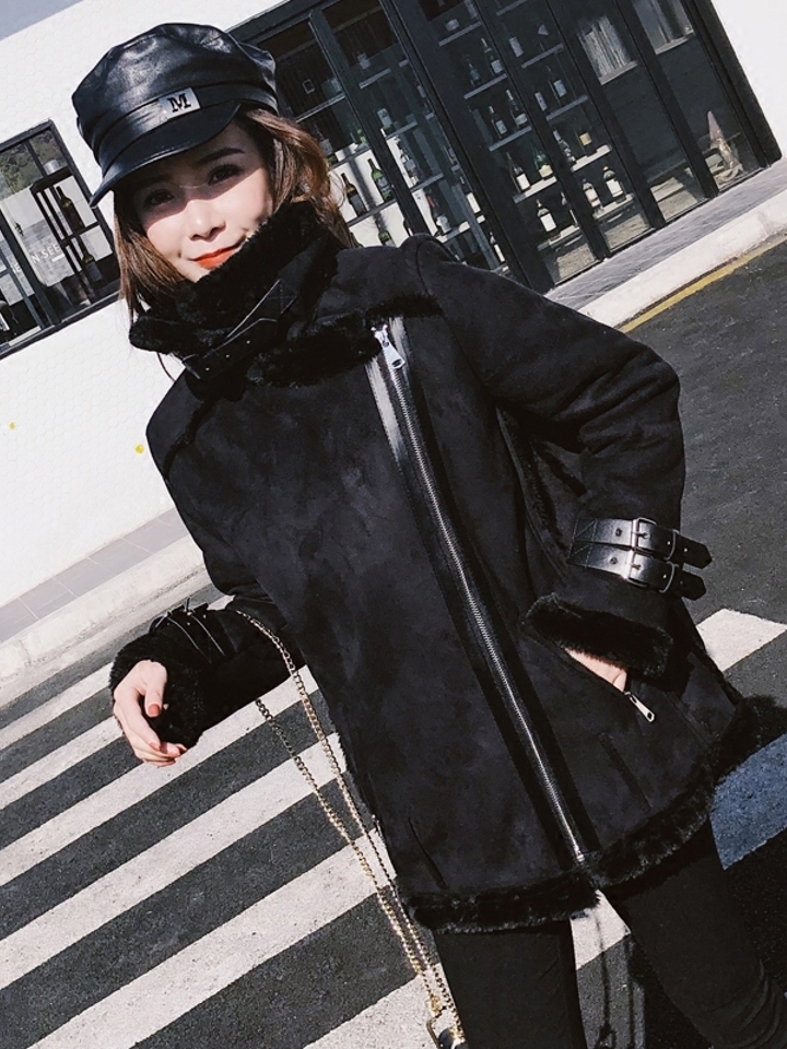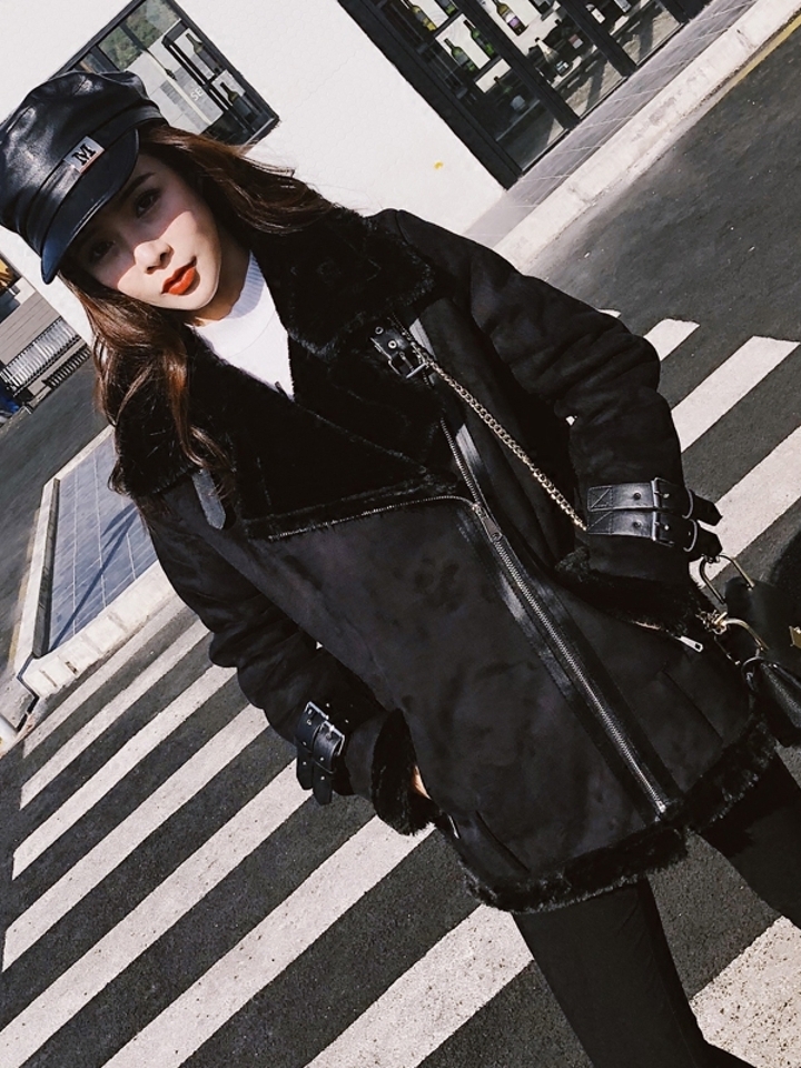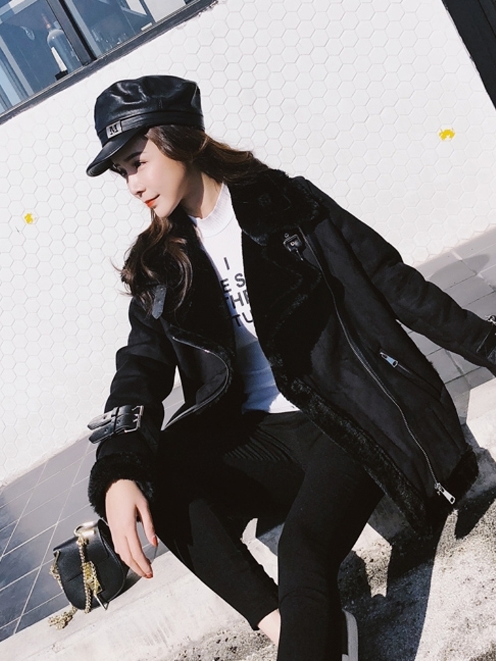 带着帅气机车服的味道,皮毛一体的设计,尽显时尚感。