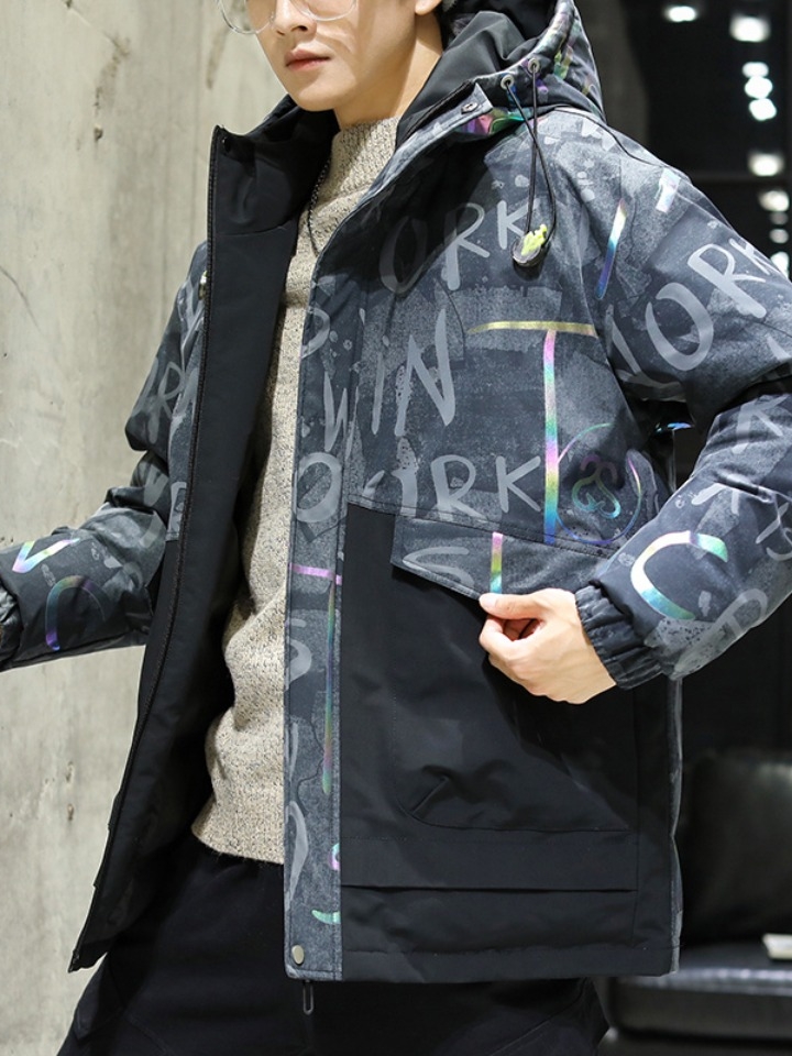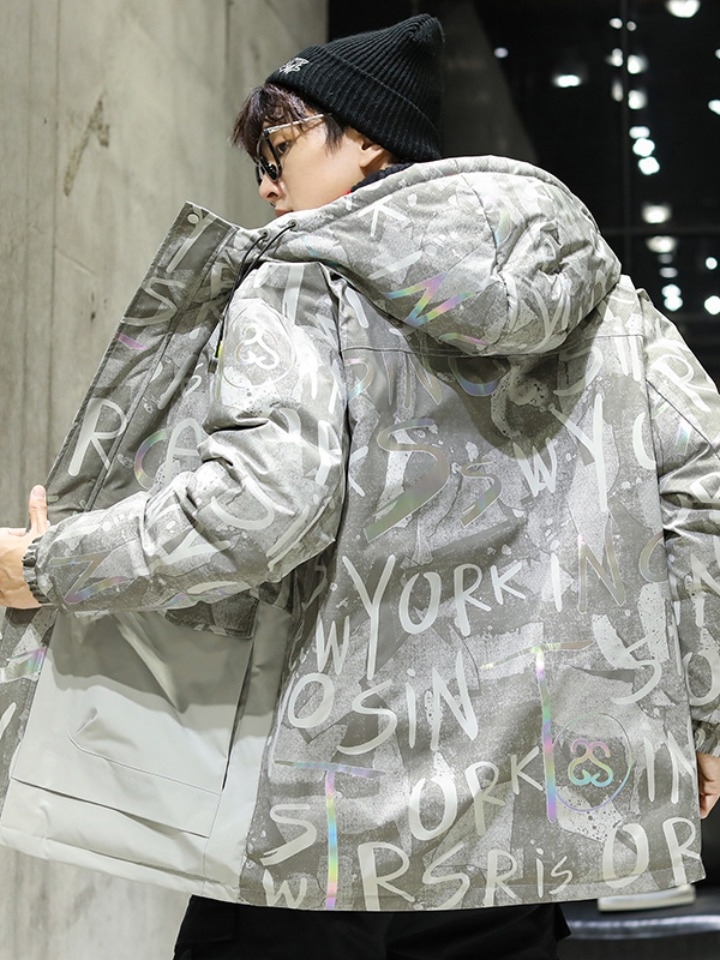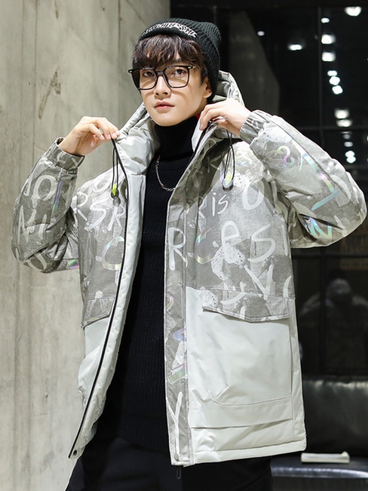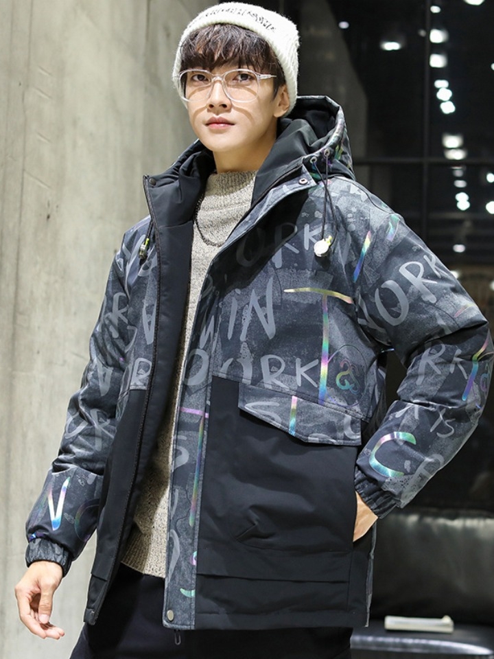 本款男士羽绒服精选90%白鸭绒,蓬松舒适,畅享奢雅生活;时髦的连帽设计,根据自己的实际需要任意打造时尚造型;印花拼接的衣身,增添了时尚潮流感。