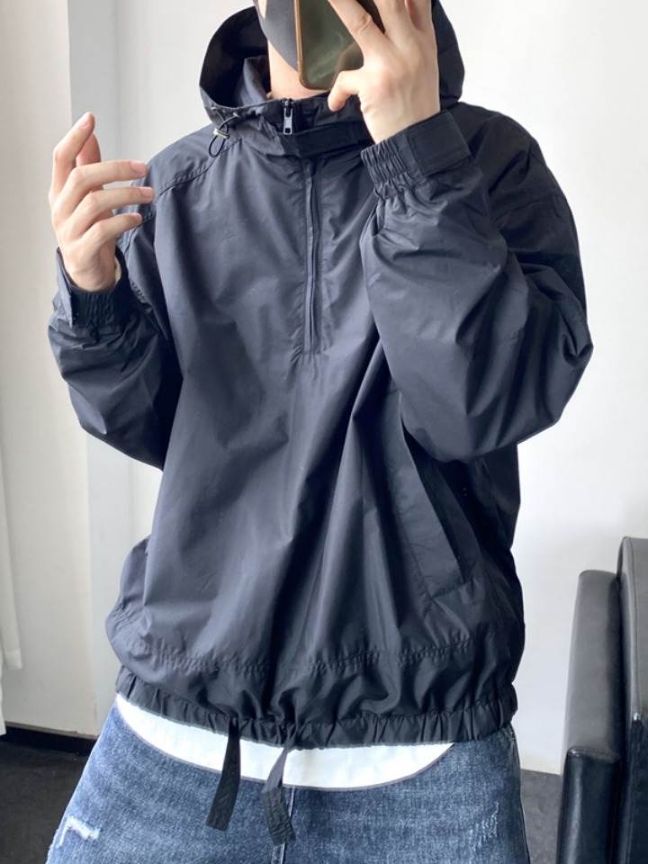 休闲工装风格的连帽夹克,以棉质布料制作衣身,面料的厚度适中,经过斜纹纺织工艺打造,让肌理感更加突出,微微的提升服饰的色泽,材质还经过水洗处理,带有做旧复古味道。下摆和袖口加入松紧材质,随意拉扯不会变形。