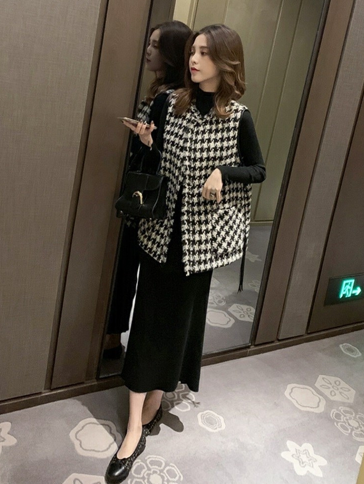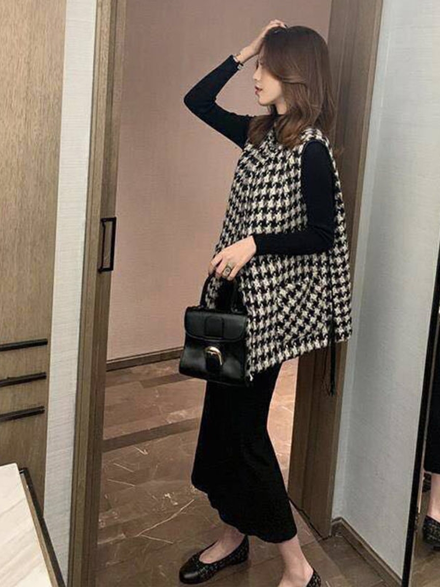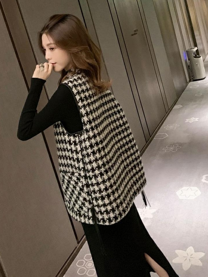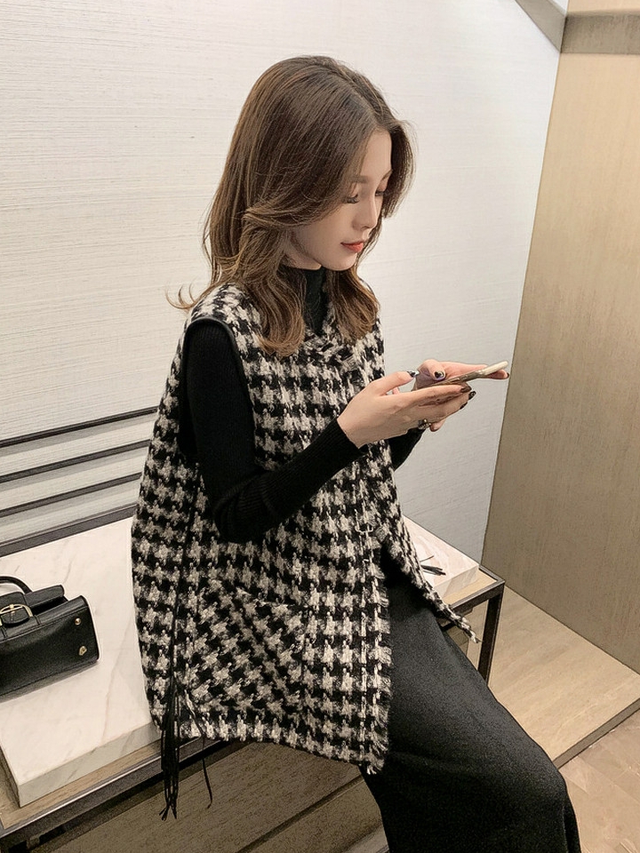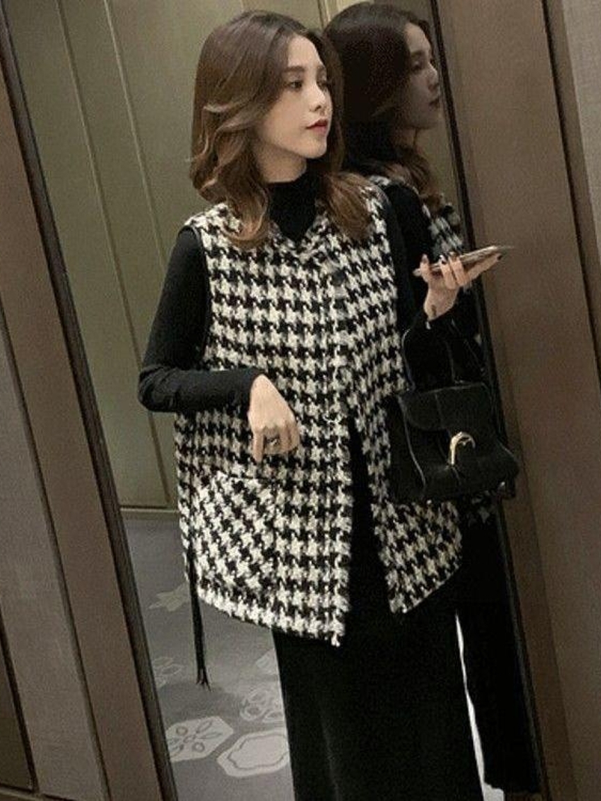 黑白色系的千鸟格纹一直都备受时尚达人们的喜爱,复古气息浓郁,也渐渐成为优雅的代名词,这款千鸟格马甲外套在修身基础上采用不对称的门襟剪裁设计,上身干练帅气。