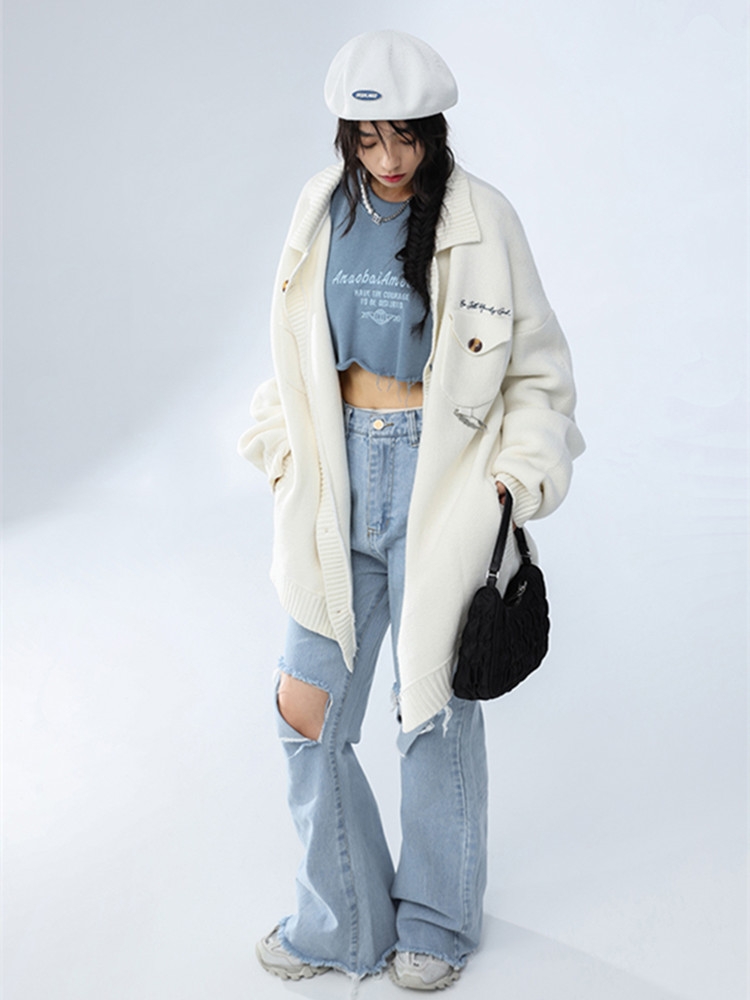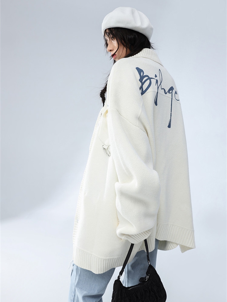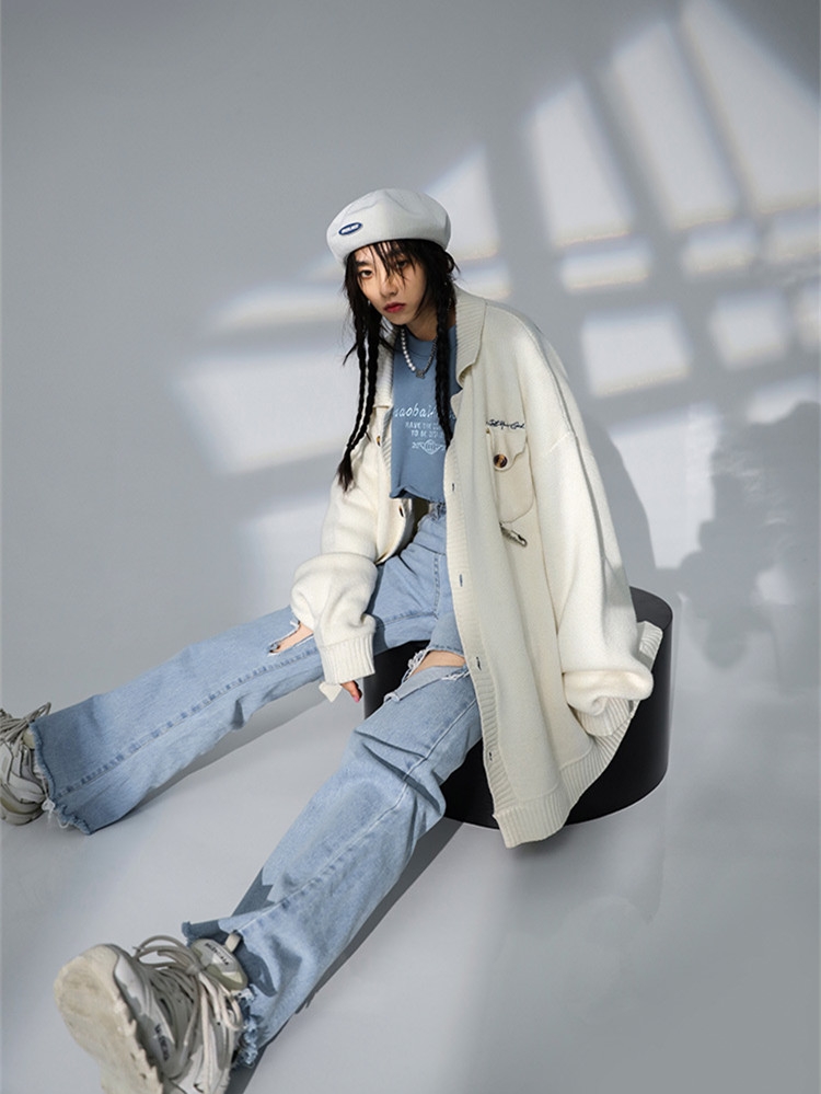 日系学院风毛衣开衫,采用左右不对称的理念设计,体现街头潮流的同时,增添一丝时装质感,毛线夹克的表现形式,既挺阔又柔软舒适。