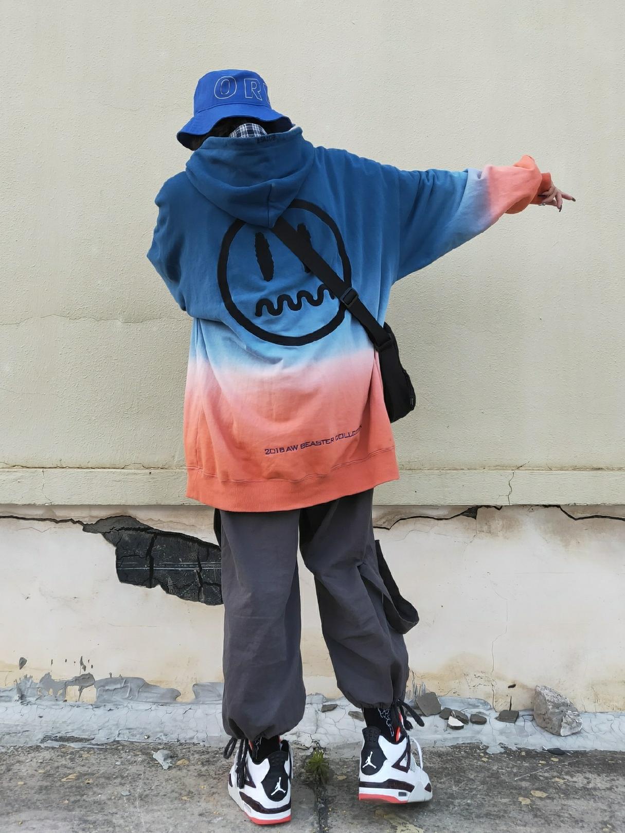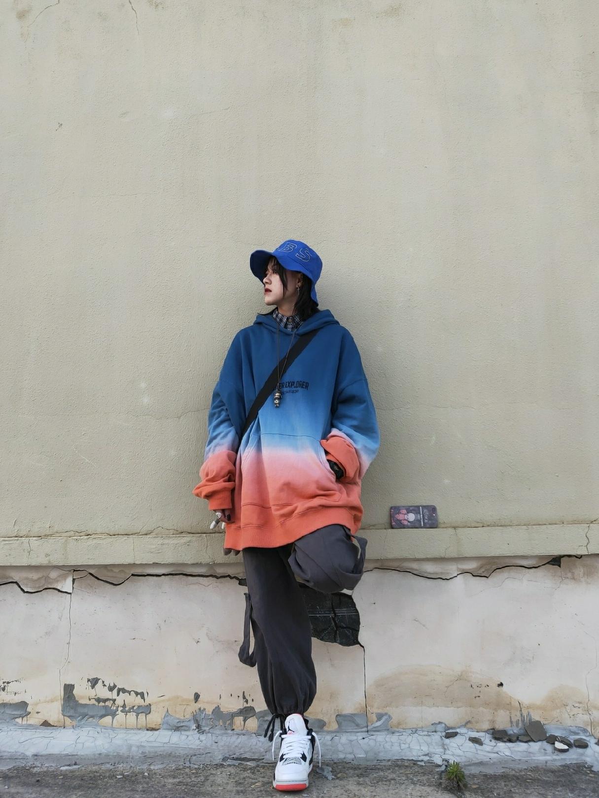 连帽的卫衣款式,渐变的颜色赋予了更多的可能性,下半身搭配直筒的牛仔裤,穿着舒适又修饰腿型,脚踩白色的老爹鞋,一顶白色棒球帽,潇洒时尚的街头风。