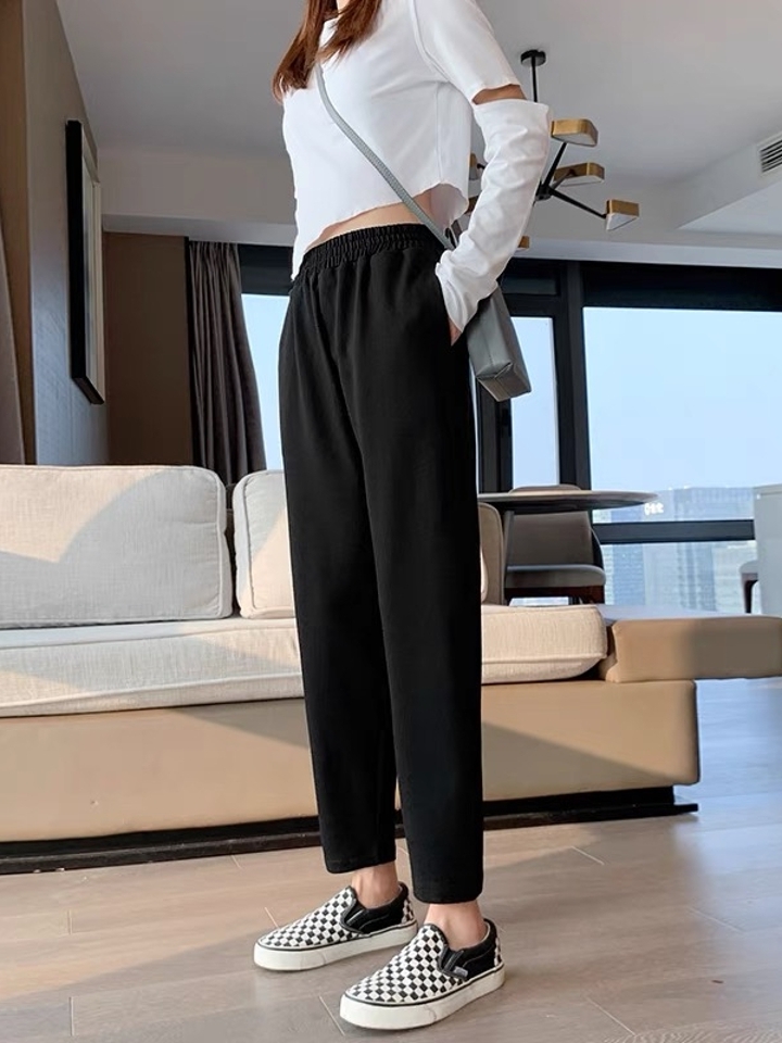 面料舒适透气,柔软亲肤,挺括有型,搭配一件T恤、一双小白鞋,九分裤型,露出脚踝,特别美式轻运动风!逛街,上班穿,或者户外运动,都很适合哒