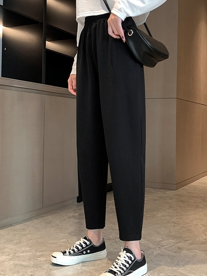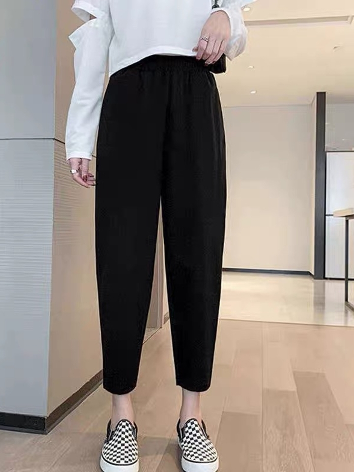 休闲款小脚裤,宽松的萝卜裤版型,腰部的捏褶丰富层次空间感,遮肉显瘦,简约的宽边腰头,裥平行线点缀,后腰中对称V型。