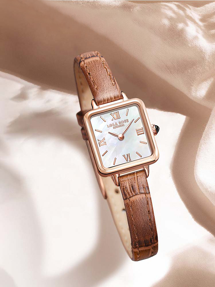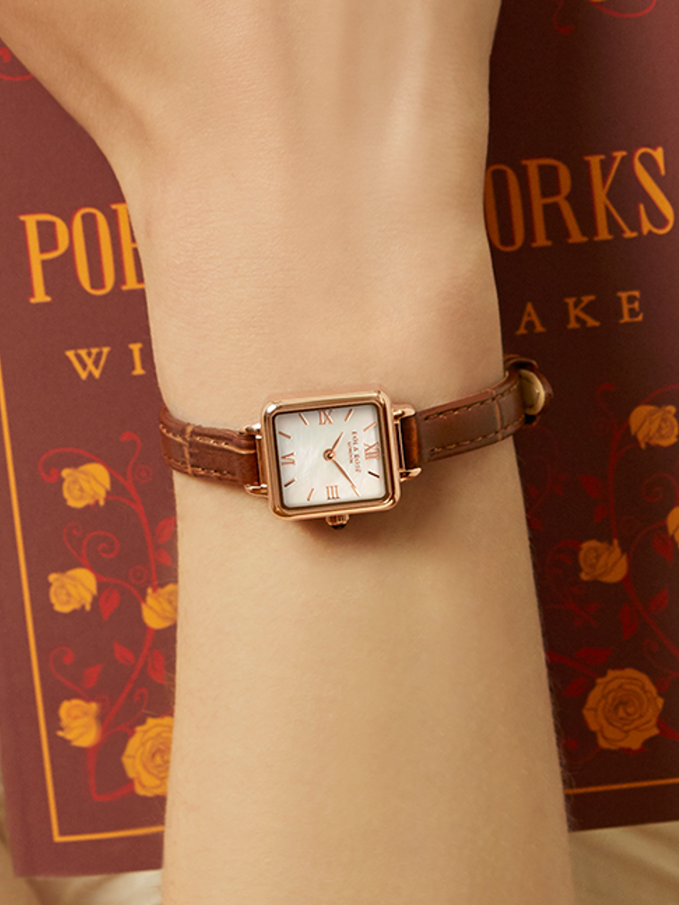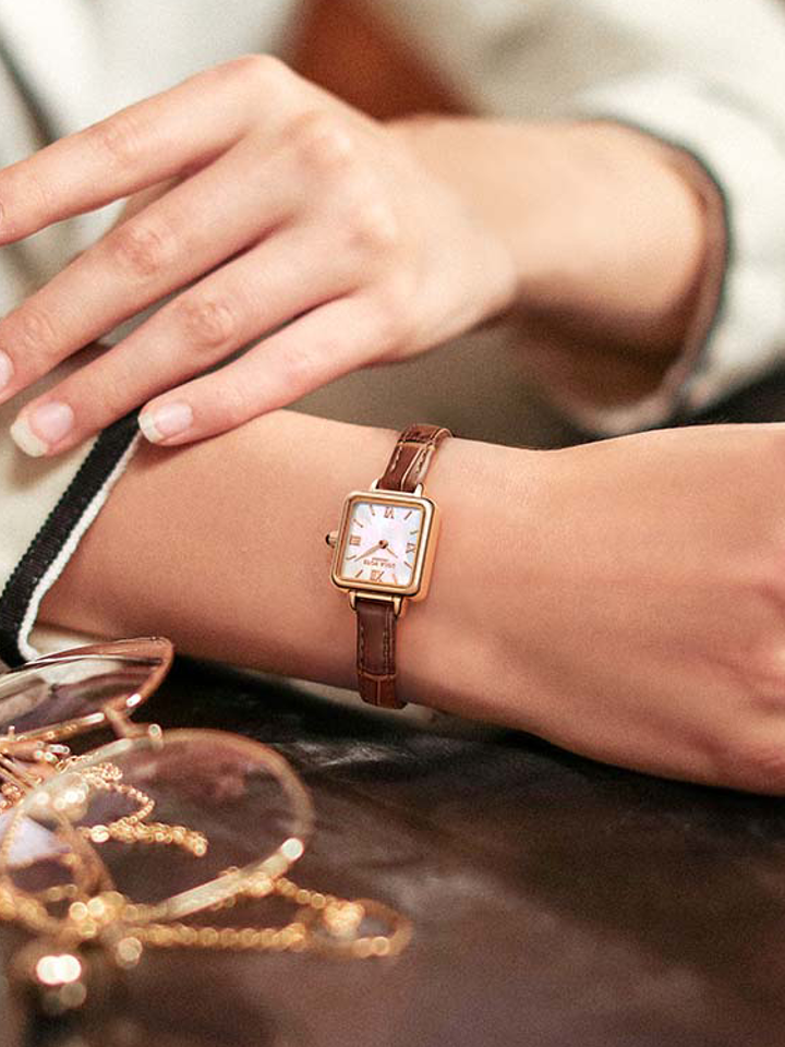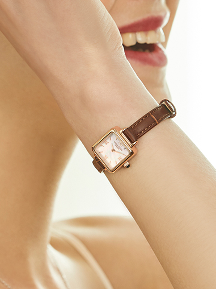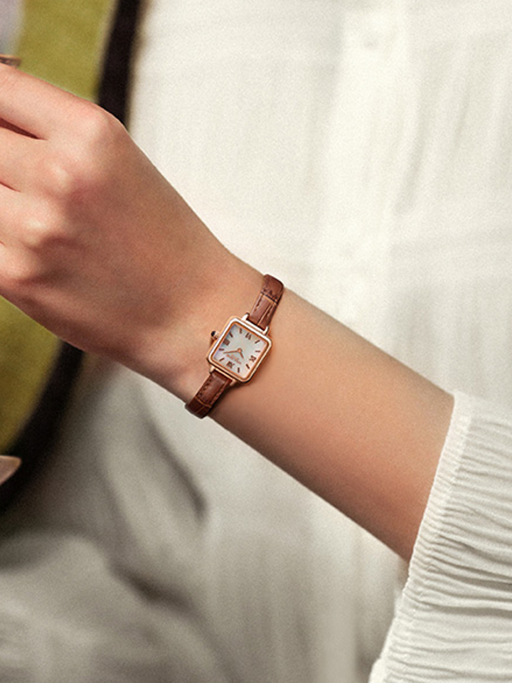 迷你方盘设计,打造奢华与高贵形象,传达和而不同的棱角,小而精,简而美。深海白母贝搭配棕色纤细表带,演绎精致优雅的复古格调。